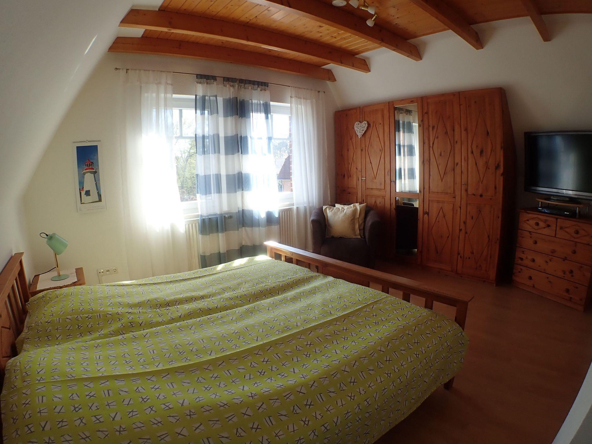 Das helle Schlafzimmer ist freundlich ausgestattet mit Doppelbett, Nachtschränken, Kleiderschrank, Kommode und Spiegel. Ein Reise-Kinderbett ist ebenfalls vorhanden. Der Raum lässt sich mit den Rolladen vollständig verdunkeln. Hochwertige Matratzen sorgen für einen guten Schlaf, der Laminatboden und die weitere Ausstattung des Hauses sind allergikerfreundlich. Ein LED-TV mit DVD Player ist vorhanden.