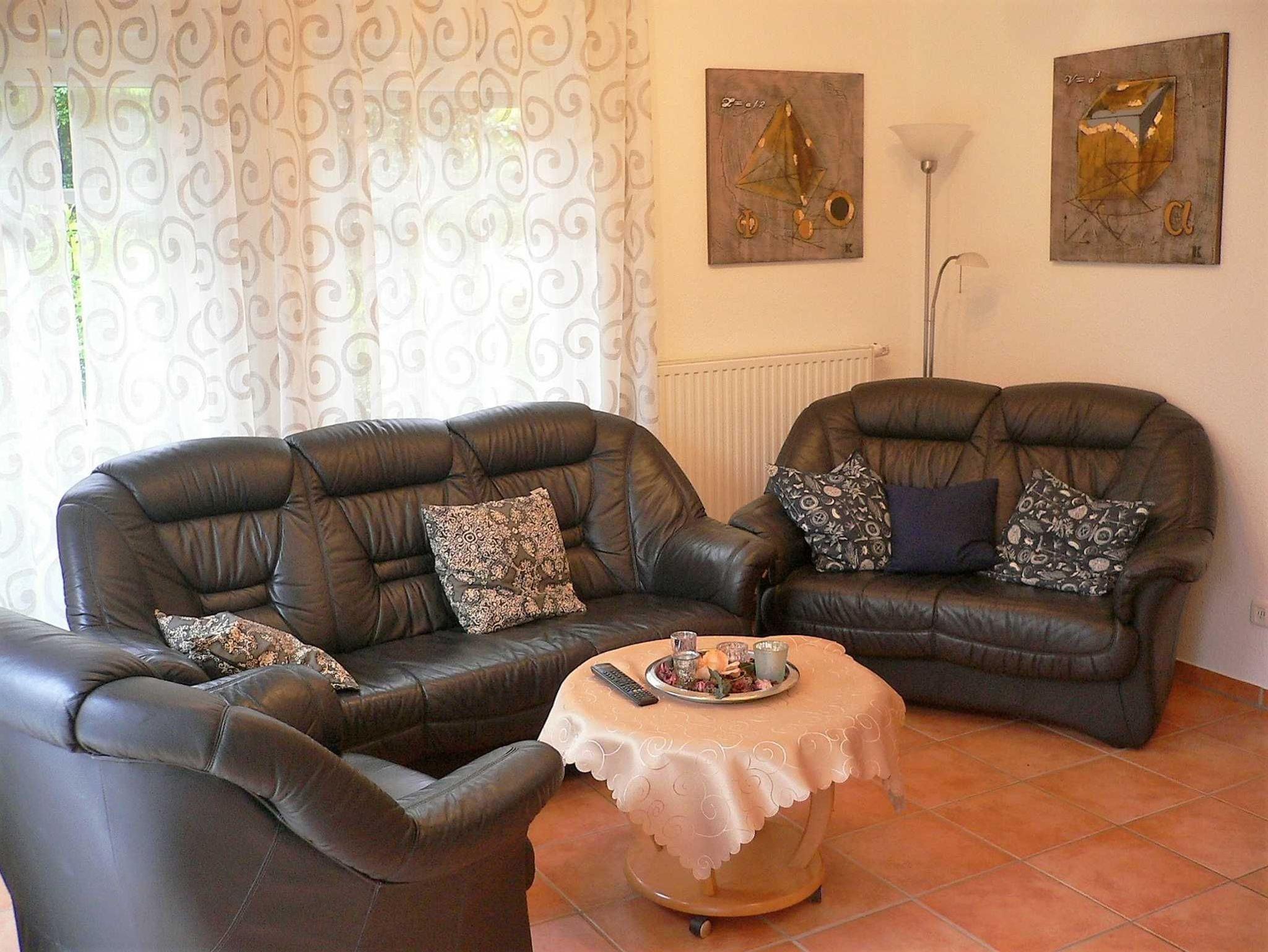 Die hochwertige Leder-Couchgarnitur besteht aus einem 3-er Sofa, einem 2-er Sofa und einem Sessel. Die bequeme Garnitur mit Federkernpolsterung lädt zum Entspannen und Klönen ein. Die Fenster verfügen über Rolladen, eines der bodentiefen Fenster ist mit einem Insektenschutzgitter ausgerüstet.