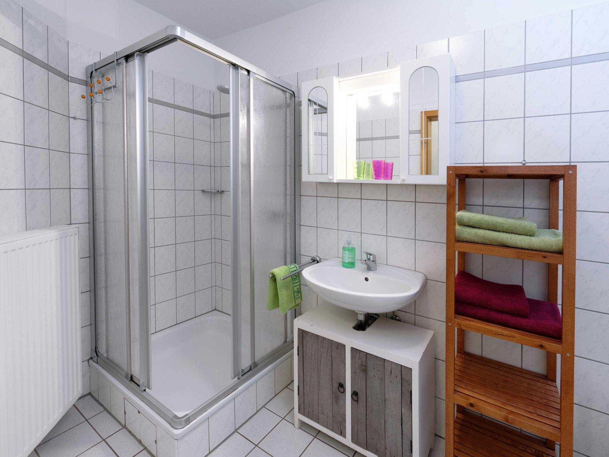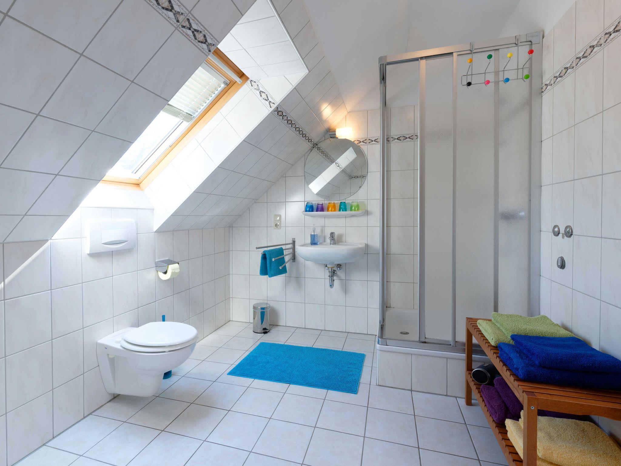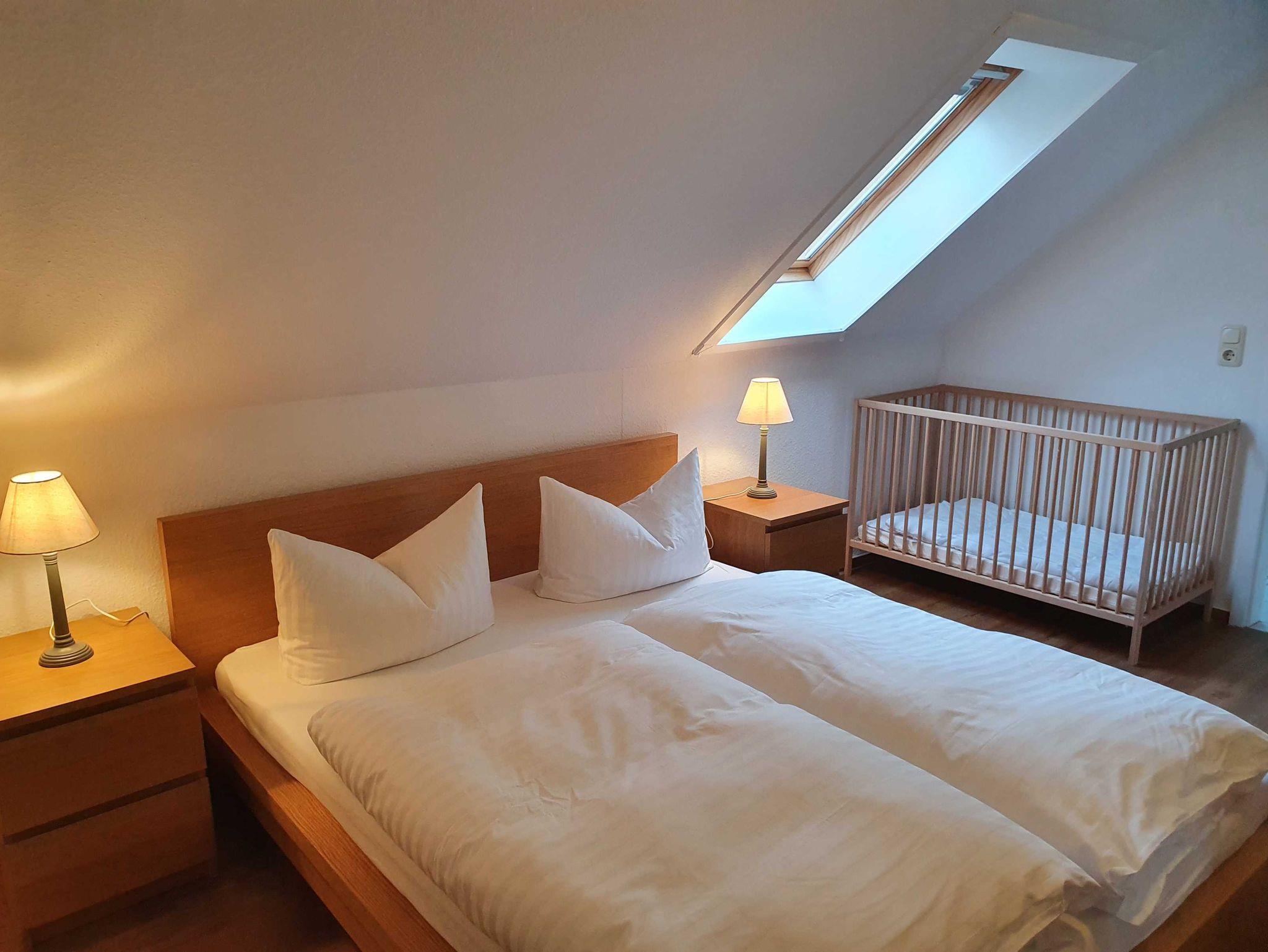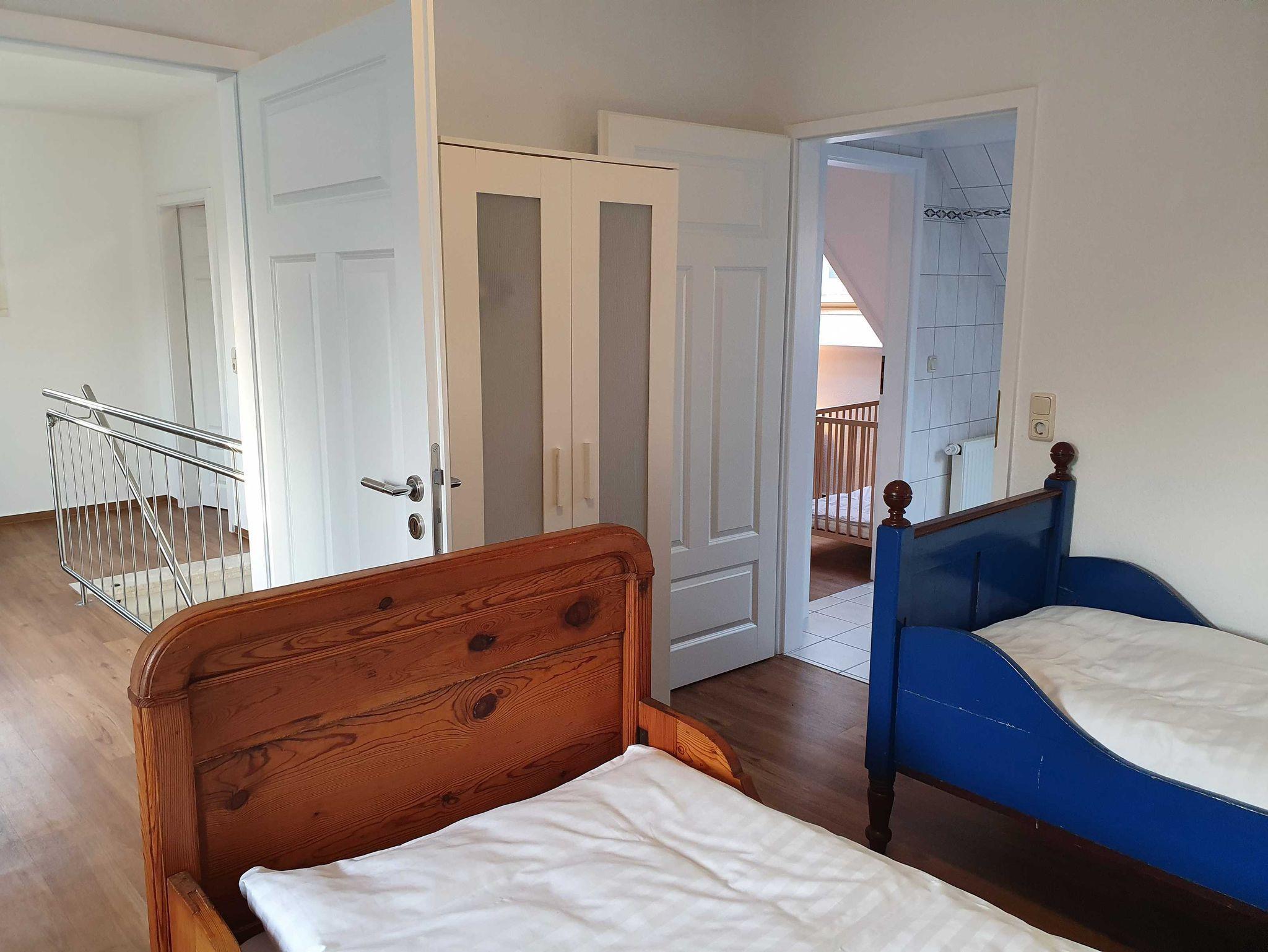 Im ersten Stock befindet sich ein weiteres Schlafzimmer mit großem Doppelbett und Kleinkindbett eine gemütliche Sitzecke sowie ein Schlafzimmer mit drei Einzelbetten und ein weiteres Duschbad (mit Fön).