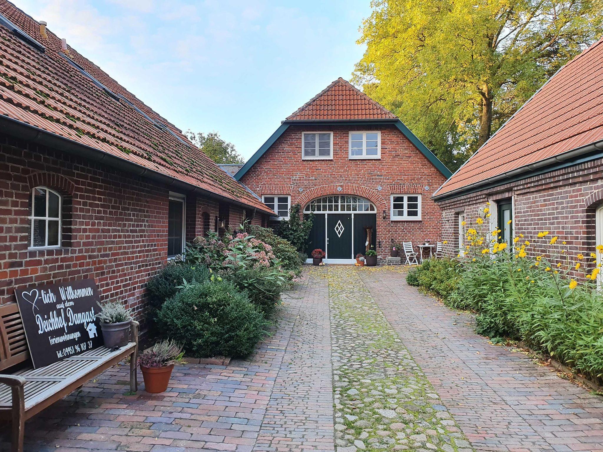 Der Deichhof Dangast ist ein ehemaliger Bauernhof in ländlicher Umgebung im historischen Ortsteil von Dangast. Unsere insgesamt fünf Ferienwohnungen befinden sich in verschiedenen Gebäudeteilen auf unserem Hof. Die beiden großen Wohneinheiten Fingerhut und Löwenzahn erstrecken sich jeweils über zwei Etagen. Das Erdgeschoss ist barrierearm und verfügt jeweils über ein Schlafzimmer und ein Duschbad mit WC. Im Obergeschoss befinden sich weitere Schlafräume und ebenfalls je Wohnung ein Duschbad mit WC. Kleinkindbetten sind in den oberen Schlafräumen vorhanden. Diese beiden Wohnungen haben einen direkten Zugang zur eigenen privaten Terrasse.