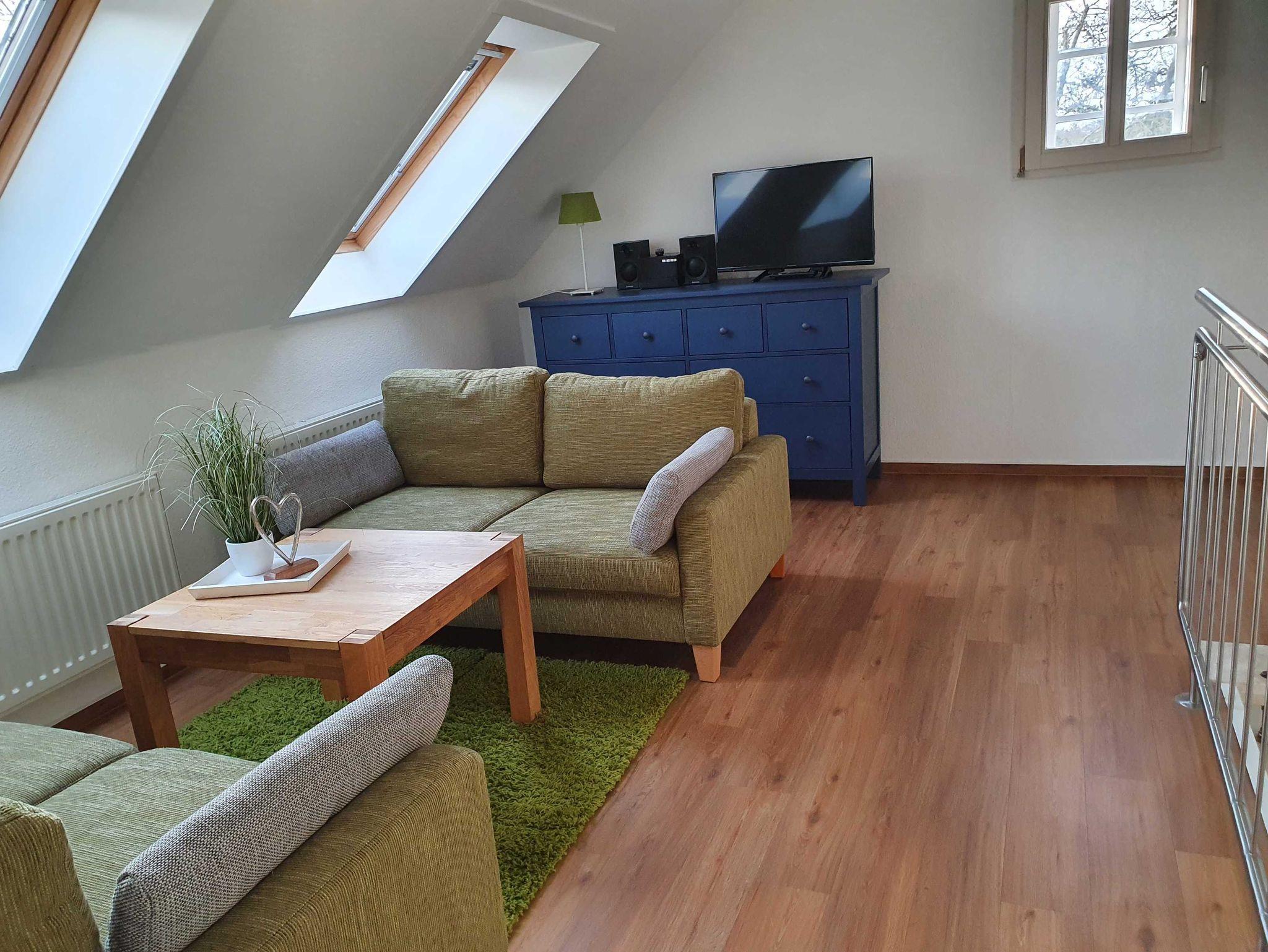 Unsere großzügige Ferienwohnung Löwenzahn erstreckt sich über zwei Etagen im ehemaligen Pferdestall unseres Hofes.
