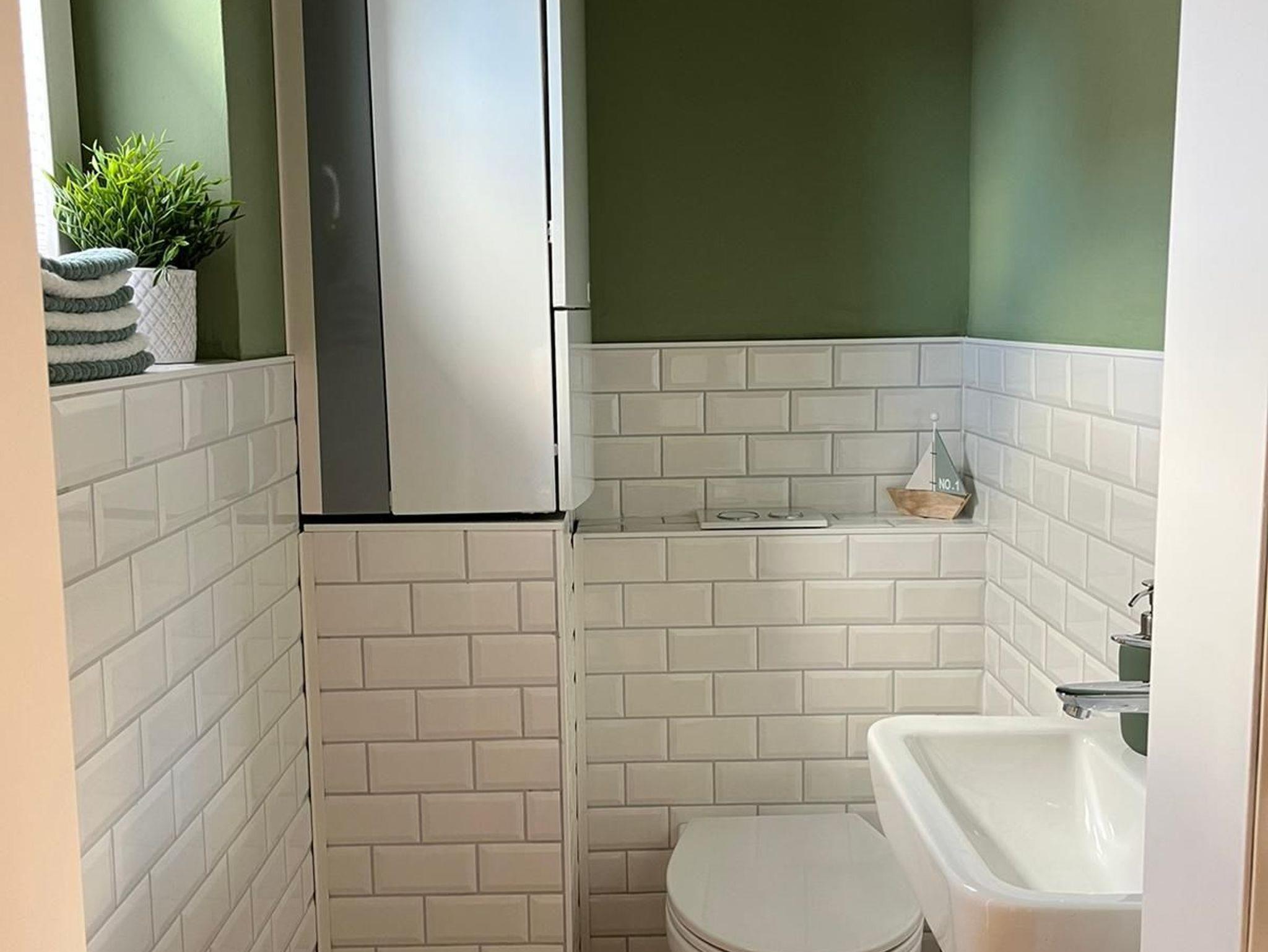 Die neue Einbauküche mit direktem Zugang in den gemütlich eingerichteten Wohn-Essbereich ist offen und modern gestaltet. Sie verfügt über eine gute Ausstattung: Ceranfeld, Backofen, Mikrowelle, Kühlschrank mit Gefrierschrank, Kaffeemaschiene sowie Zubehör in gutem Zustand.