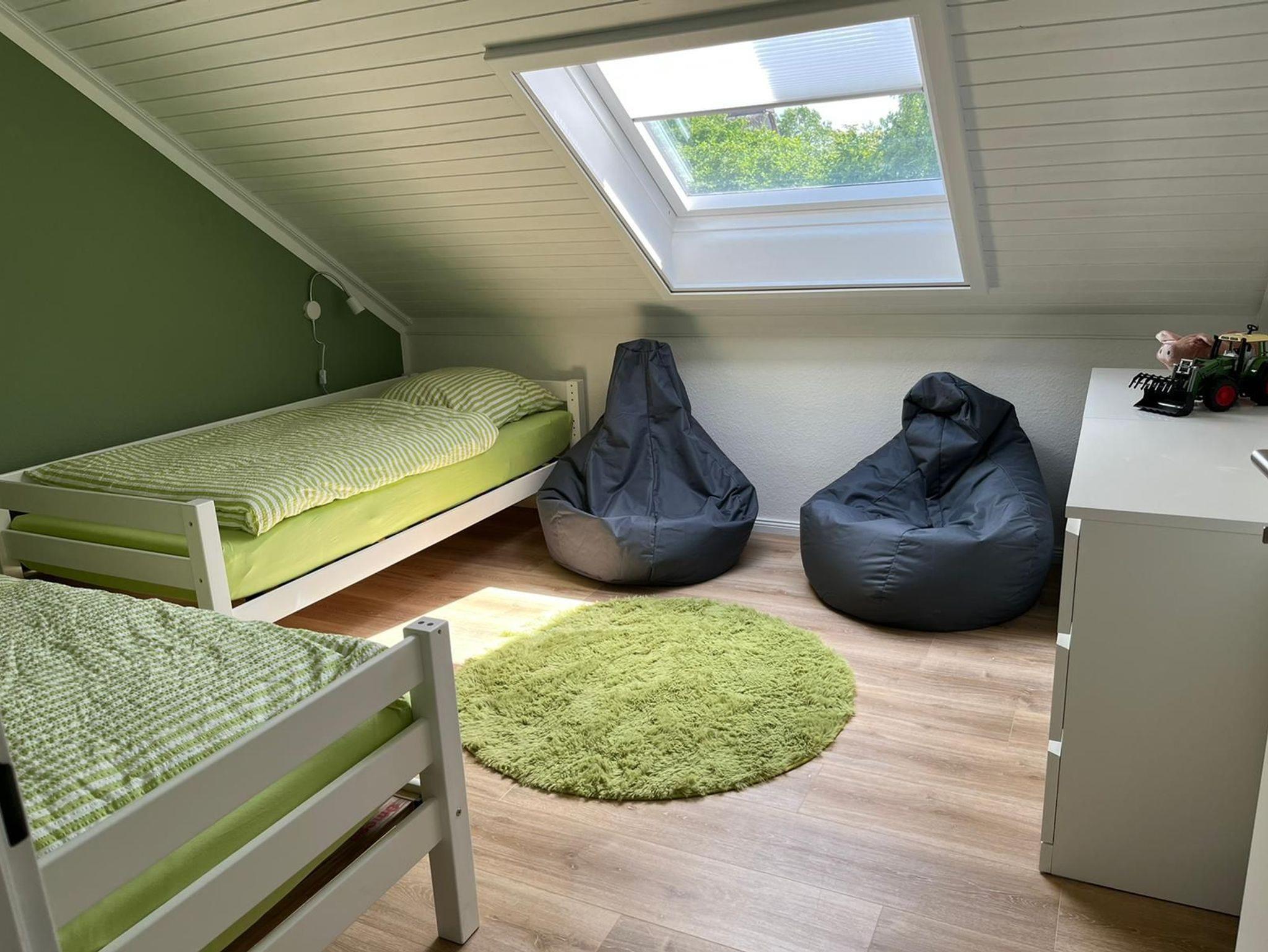 Ein Schlafzimmer verfügt über ein Doppelbett von 1,60 x 2,00 m und das andere Schlafzimmer über zwei Einzelbetten von 1,00 x 2,00 m. Beide Schlafräume sind mit Plisee Verdunkelung und Rolladen ausgestattet. Auf der gleichen Etage befinden sich eine Waschmaschine, die Benutzung ist inklusiv. Wäscheständer ist vorhanden.
