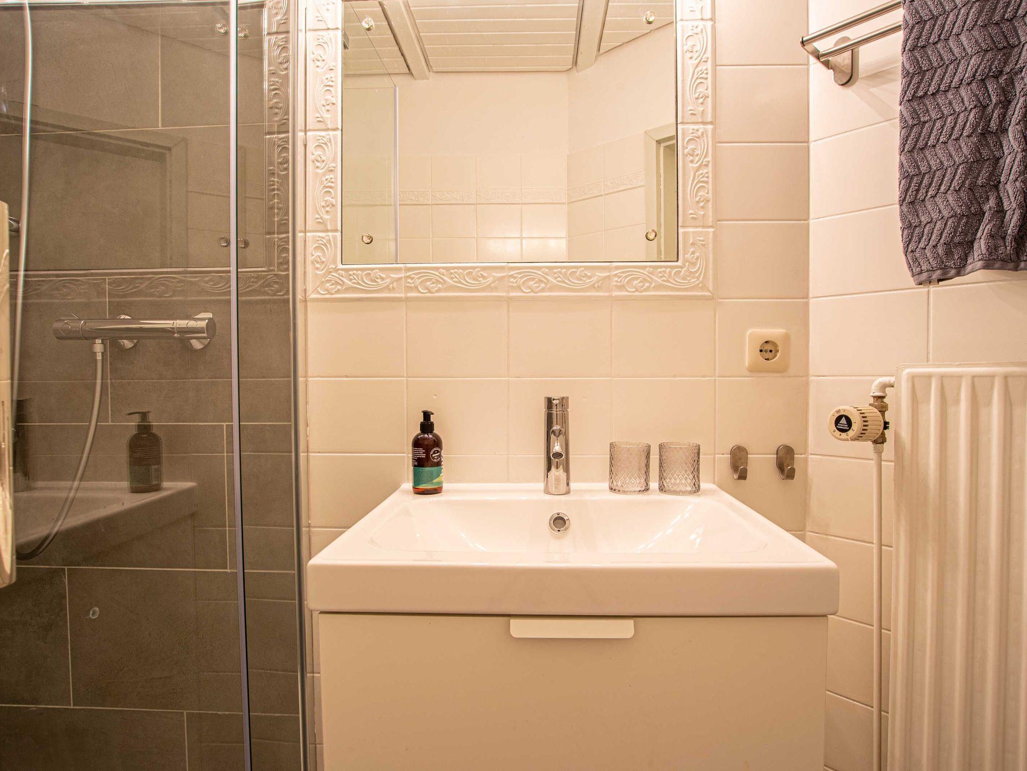 Im ersten Obrgeschoss befinden sich drei freundlich und hell eingerichtete Schlafzimmer. Ein Schlafzimmer mit Doppelbett, ein Zimmer mit Etagenbett sowie das dritte Zimmer mit einem Babybett sowie einem Einzelbett. Auf dieser Ebene ist auch das moderne helle Duschbad mit Waschplatz.