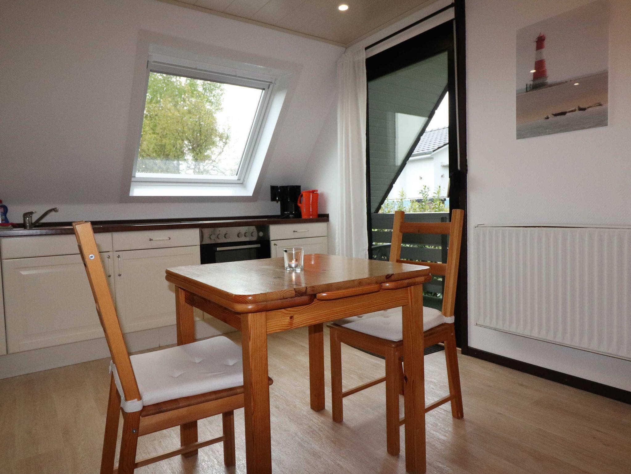 Die etwa 39m² große Wohnung im Obergeschoss links bietet den Blick auf den Jadebusen aus dem Dachfenster an der Küchenzeile. Auch in dieser Wohnung gibt es neben dem Wohn-/Esszimmer mit Küchenzeile ein Schlafzimmer mit zwei Einzelbetten (90 cm x 2,00m), das Badezimmer dieser Wohnung ist mit einer Badewanne ausgestattet. Die Wohnung verfügt über eine moderne technische Ausstattung: neben einem Radio mit CD-Laufwerk steht Ihnen ein moderner Flachbildfernseher mit Satellitenempfang zur Verfügung. Die voll ausgestattete Küche bietet neben einer Mikrowelle, einem Kühlschrank und einer Kaffeemaschine auch einen Geschirrspüler, so dass Sie in Ihrem Urlaub auf keinen Komfort verzichten müssen. Für weitere Gäste lässt sich das Sofa im Wohnzimmer zu einem vollwertigen Doppelbett ausklappen, so dass insgesamt bis zu vier Personen in unserer Wohnung im Obergeschoss links Platz finden.