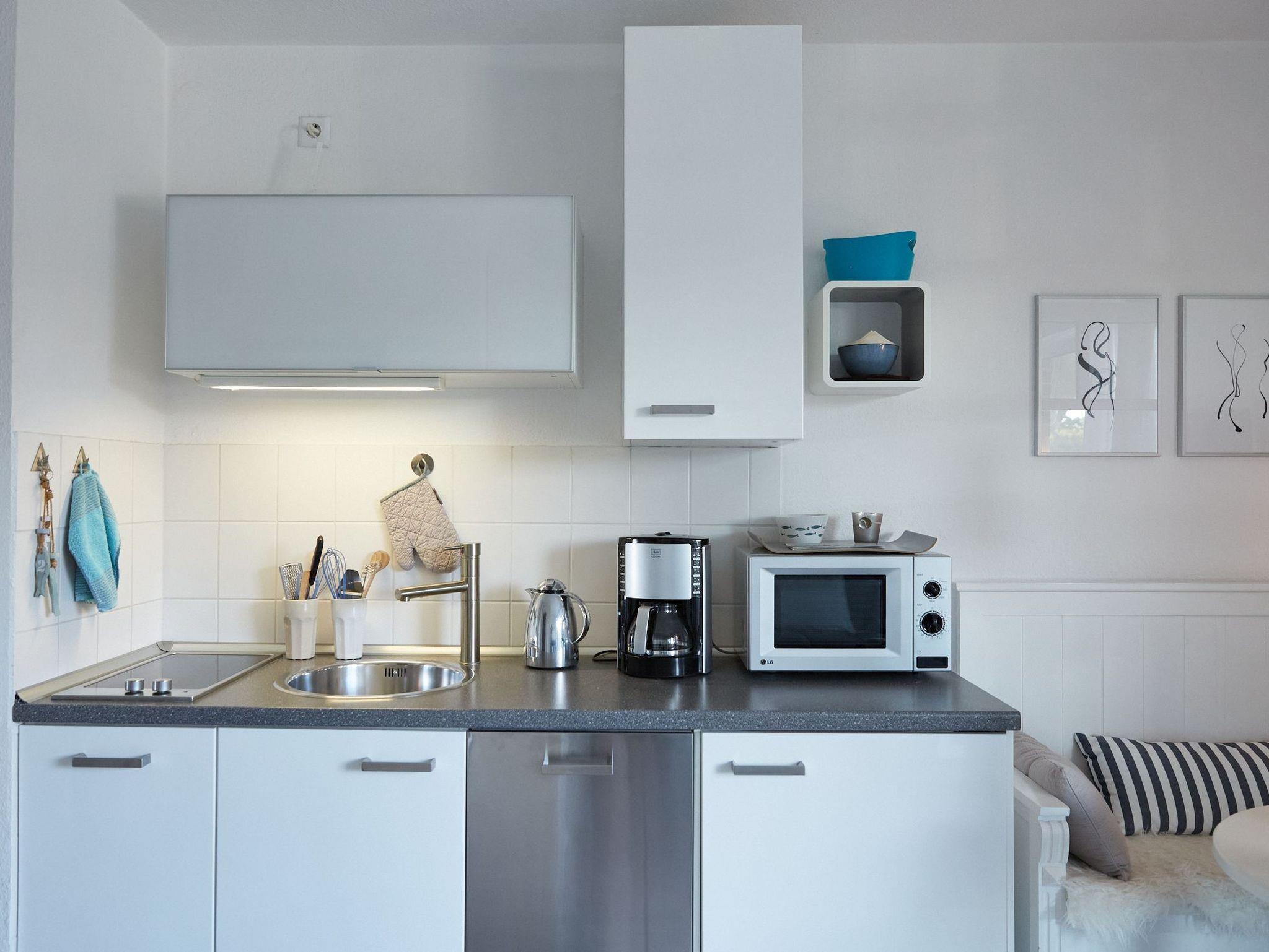 moderne Küchenzeile mit Spülmaschine, Kühlschrank, Herd, Mikrowelle, Toaster, Wasserkocher etc.
