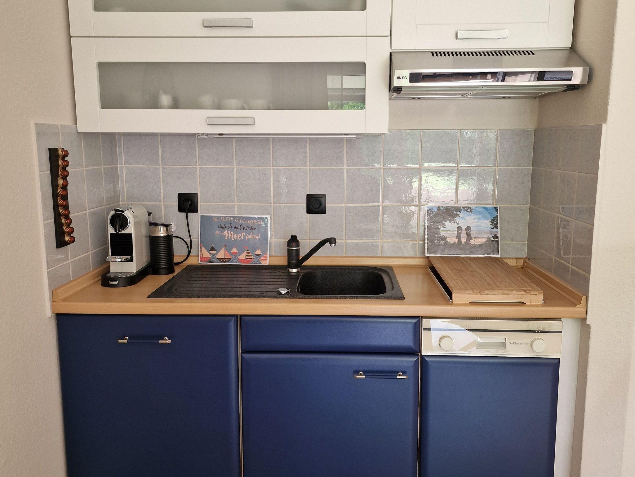 Kuche und Haushalt: Einbaukuche, Kuhlschrank mit Gefrierschrank, 2-Zonen Cerankochfeld, Dunstabzugshaube, Geschirrspuler, Topfset, Kaffeefiltermaschine, Nespresso Maschine inkl. Kapseln, Toaster, Wasserkocher, hochwertiges Geschirr, Gläser etc.