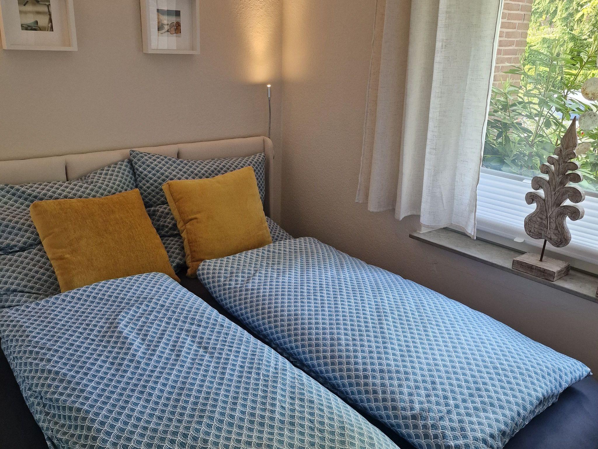 Schlafzimmer: hochwertiges, gemütliches Bett mit 7-Zonen Matratze (Maße: 160 x 200 cm), komplett zu verdunkeln
