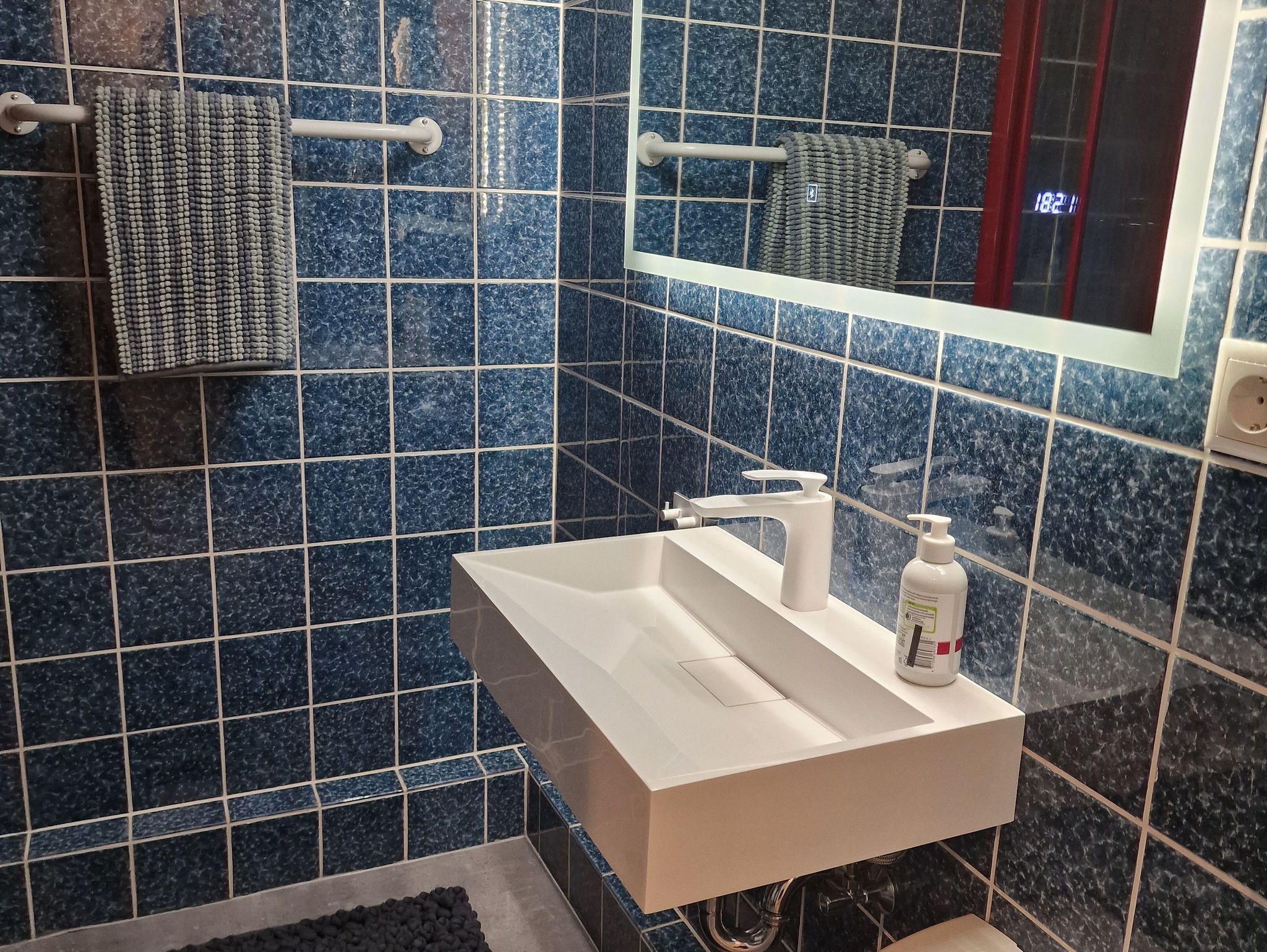 Vom Eingangsbereich gleich rechts gehalten geht es in das Duschbad mit WC. Die geräumige Dusche sowie der beleuchtete, mit Bluetooth-Musik und Schminkspiegel ausgestattete große Spiegel über dem Waschbecken bieten aller höchsten Komfort.
