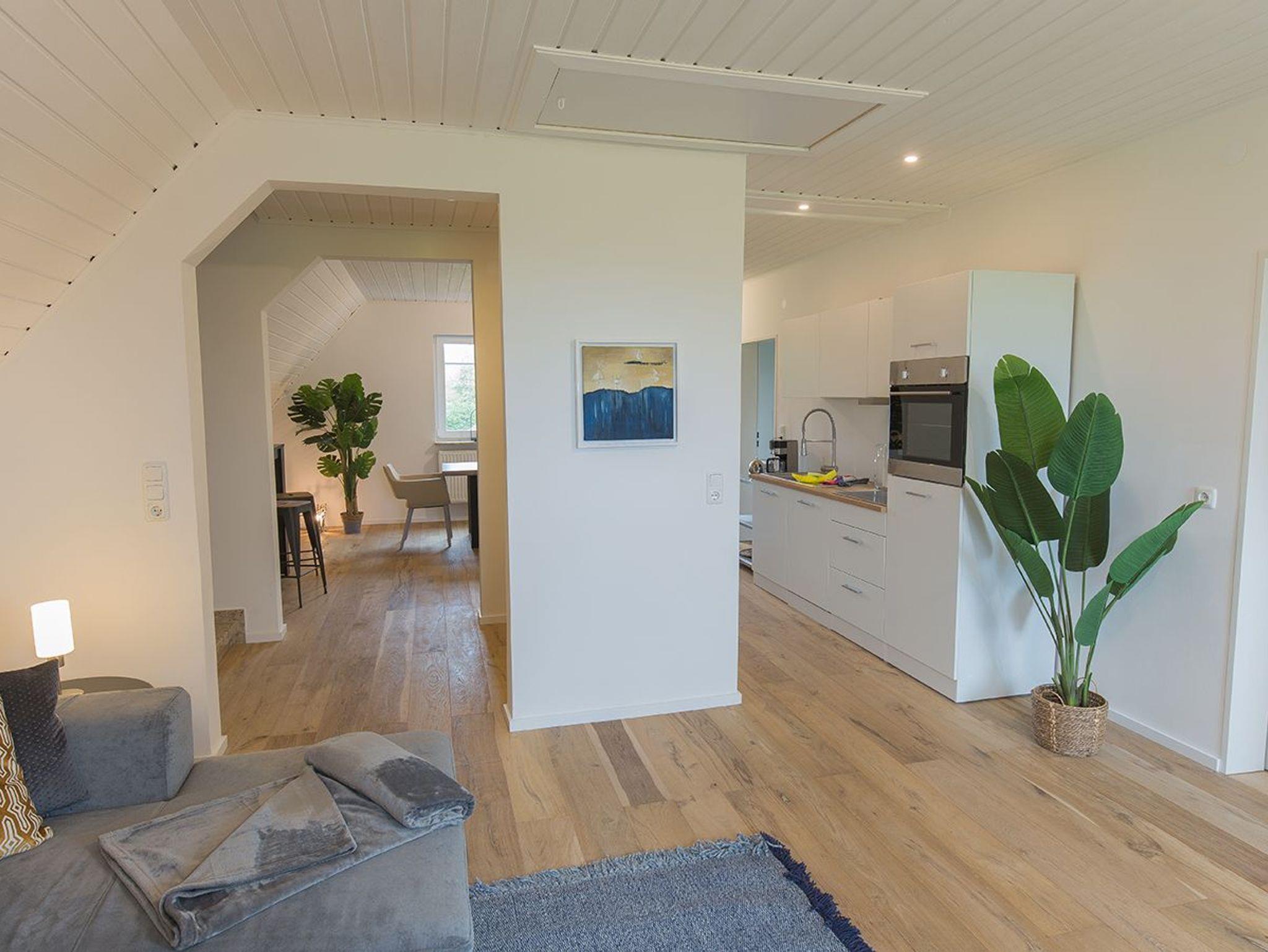 Moderne Ferienwohnung Fresenhuus 3 in Dangast mit Sauna und Panoramablick auf Felder und Wiesen.