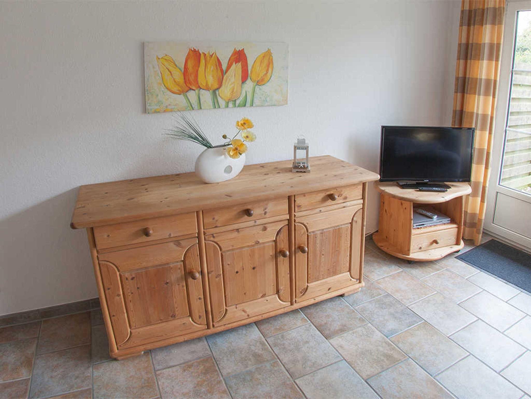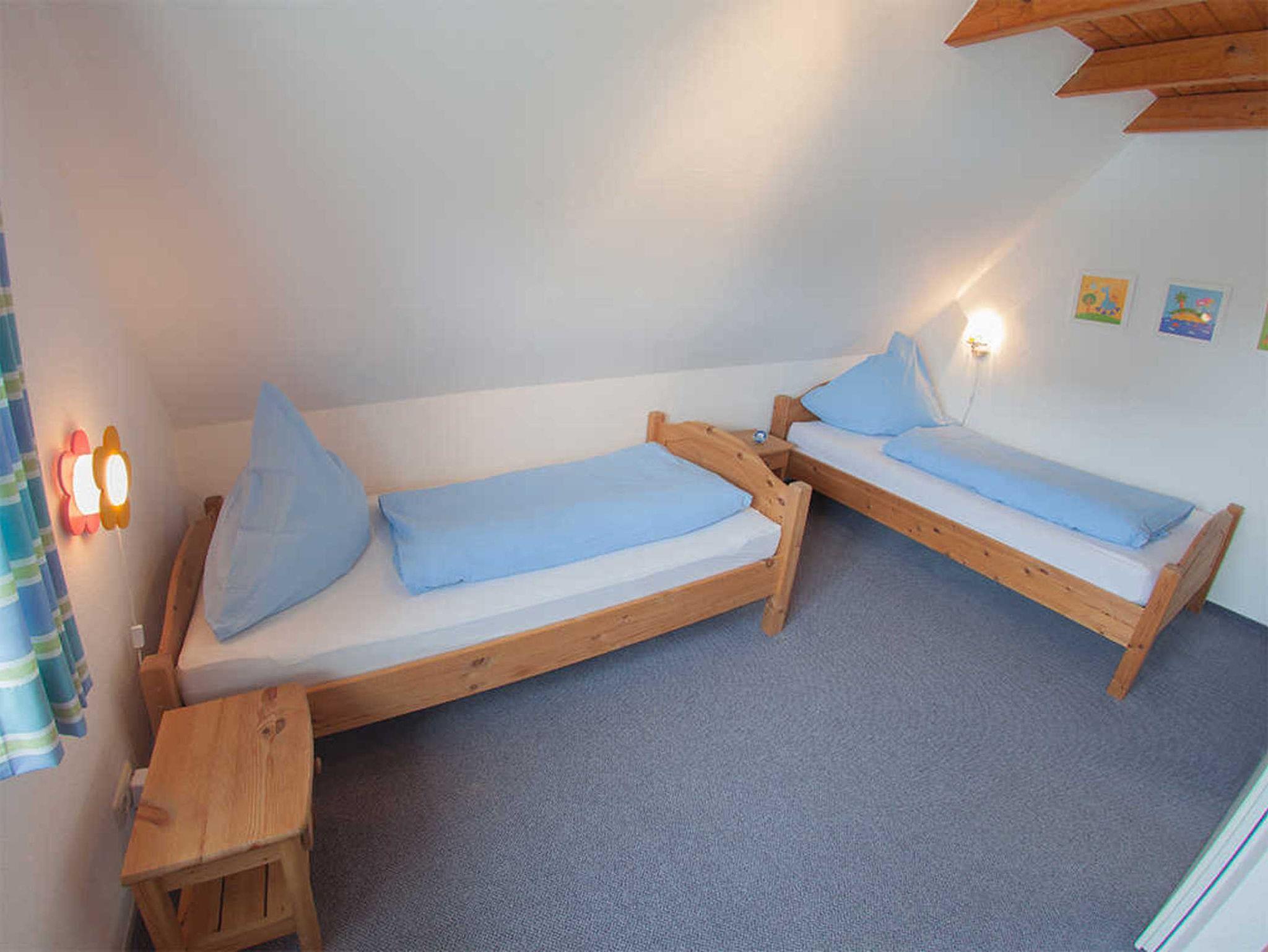 Im Obergeschoss gibt es ein helles Fenster-Duschbad mit Waschmaschine und die beiden Schlafräume: je ein Schlafzimmer mit Doppelbett und ein Schlafraum mit zwei Einzelbetten. Ein Treppenschutzgitter ist vorhanden.
