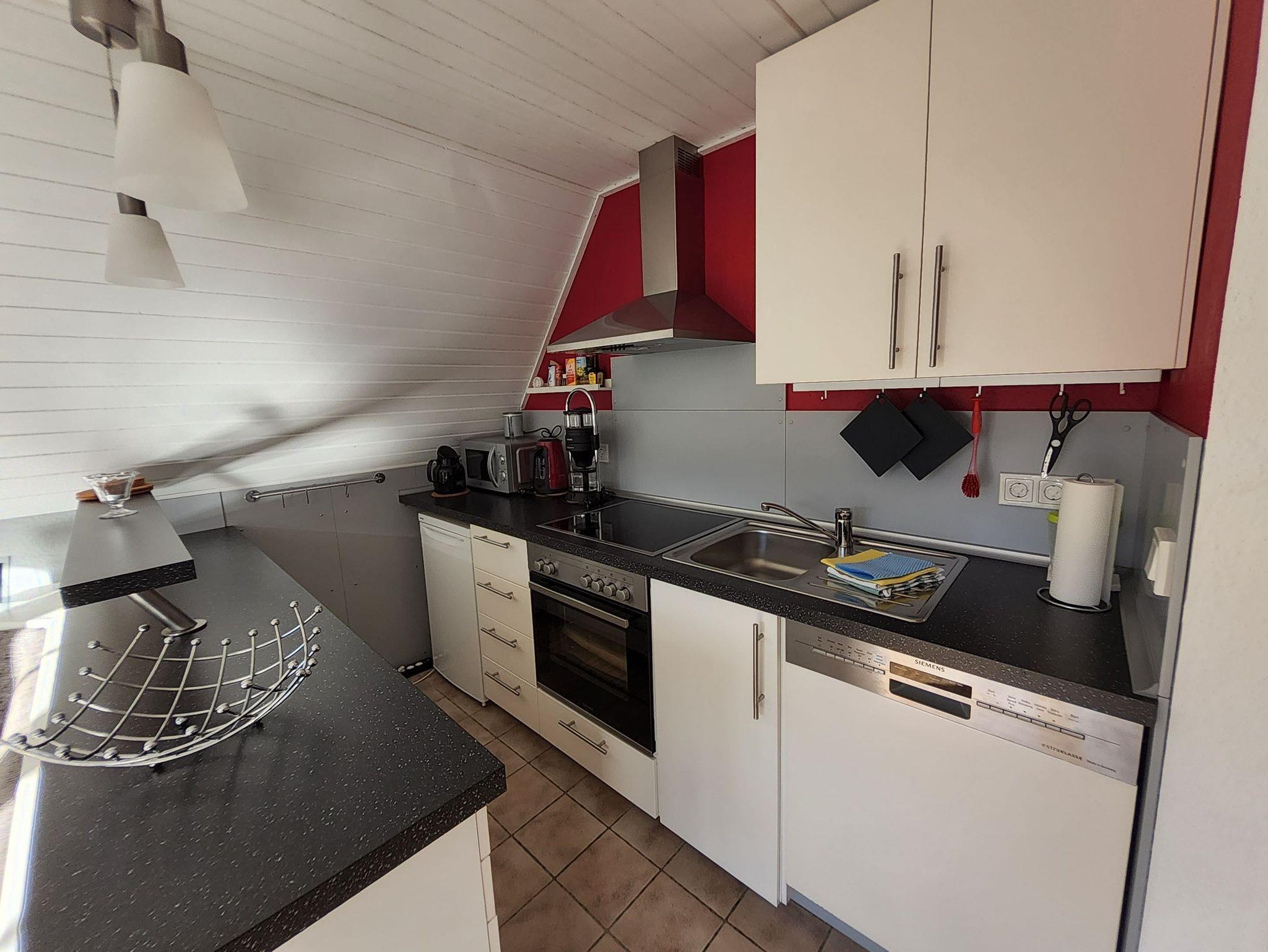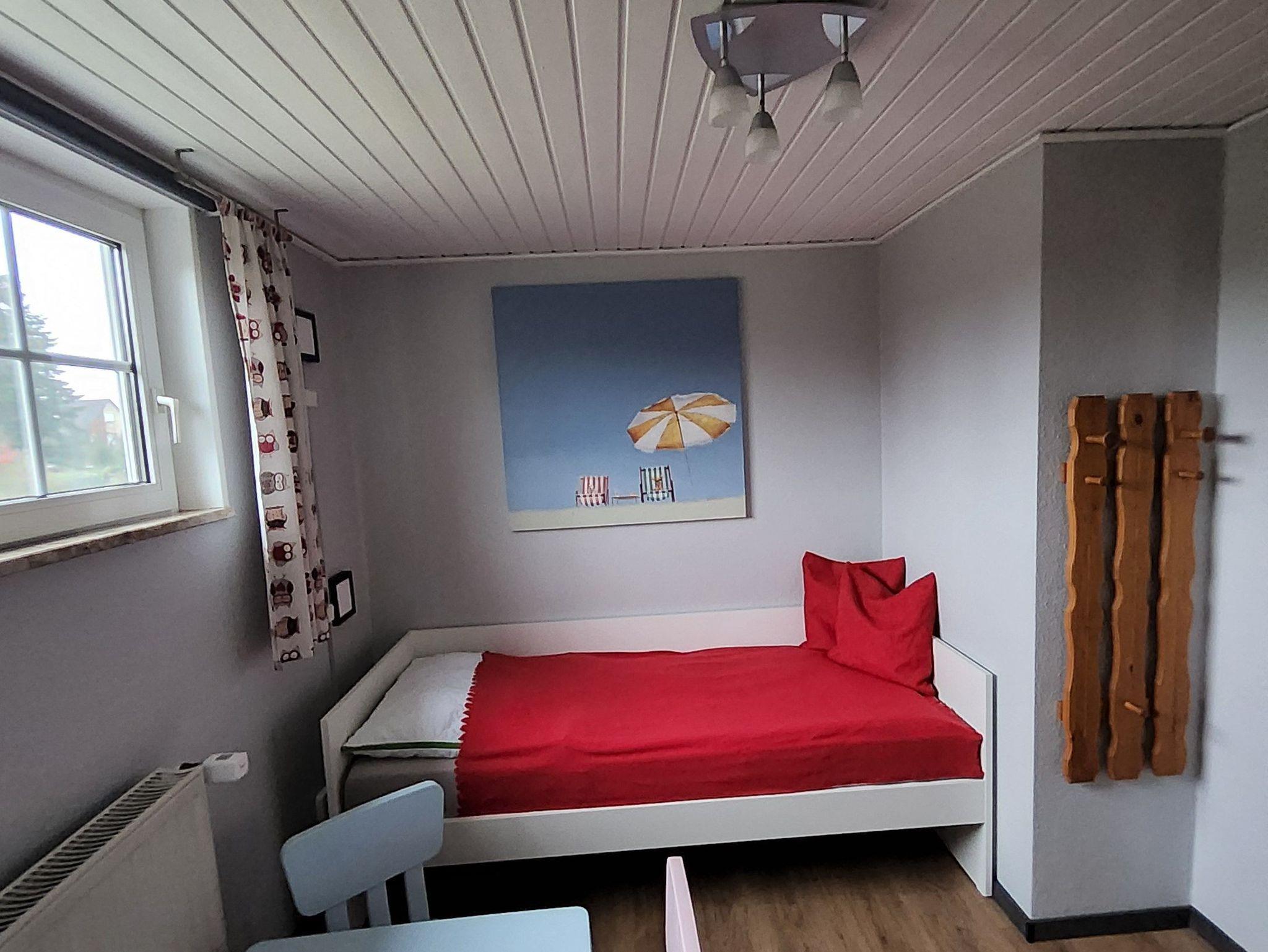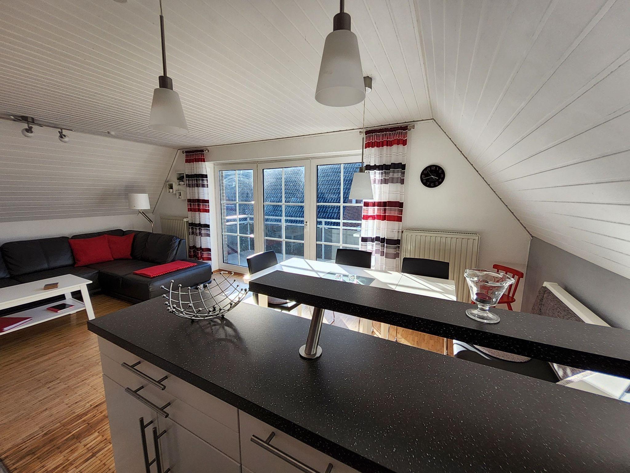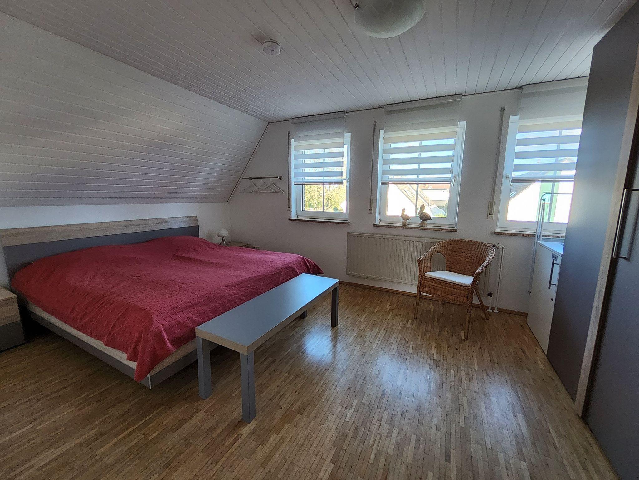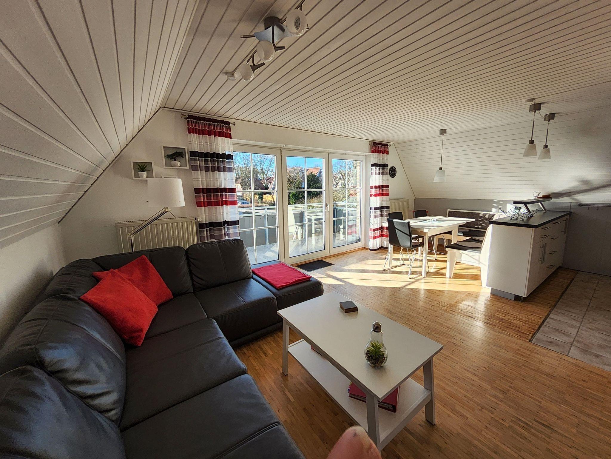 Komfort-Ferienwohnung mit einer Grundfläche von ca. 85 m2 bietet Platz für 5 Feriengäste. Die Wohnung befindet sich im Obergeschoss einer Doppelhaushälfte mit separatem Eingang, ausgebautem Dachgeschoss und Balkon.