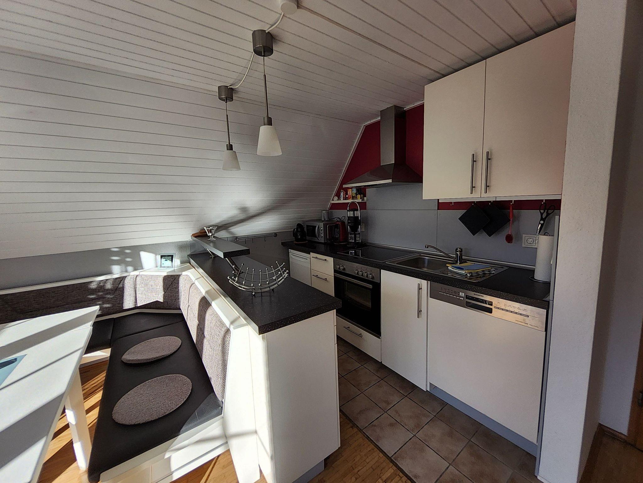 Das geräumige Wohnzimmer wird ergänzt durch eine Einbauküche und gemütlicher Essecke mit ausziehbarem Esstisch (max. 2 m). Vom Wohnzimmer aus ist der Süd-Westbalkon zu erreichen.