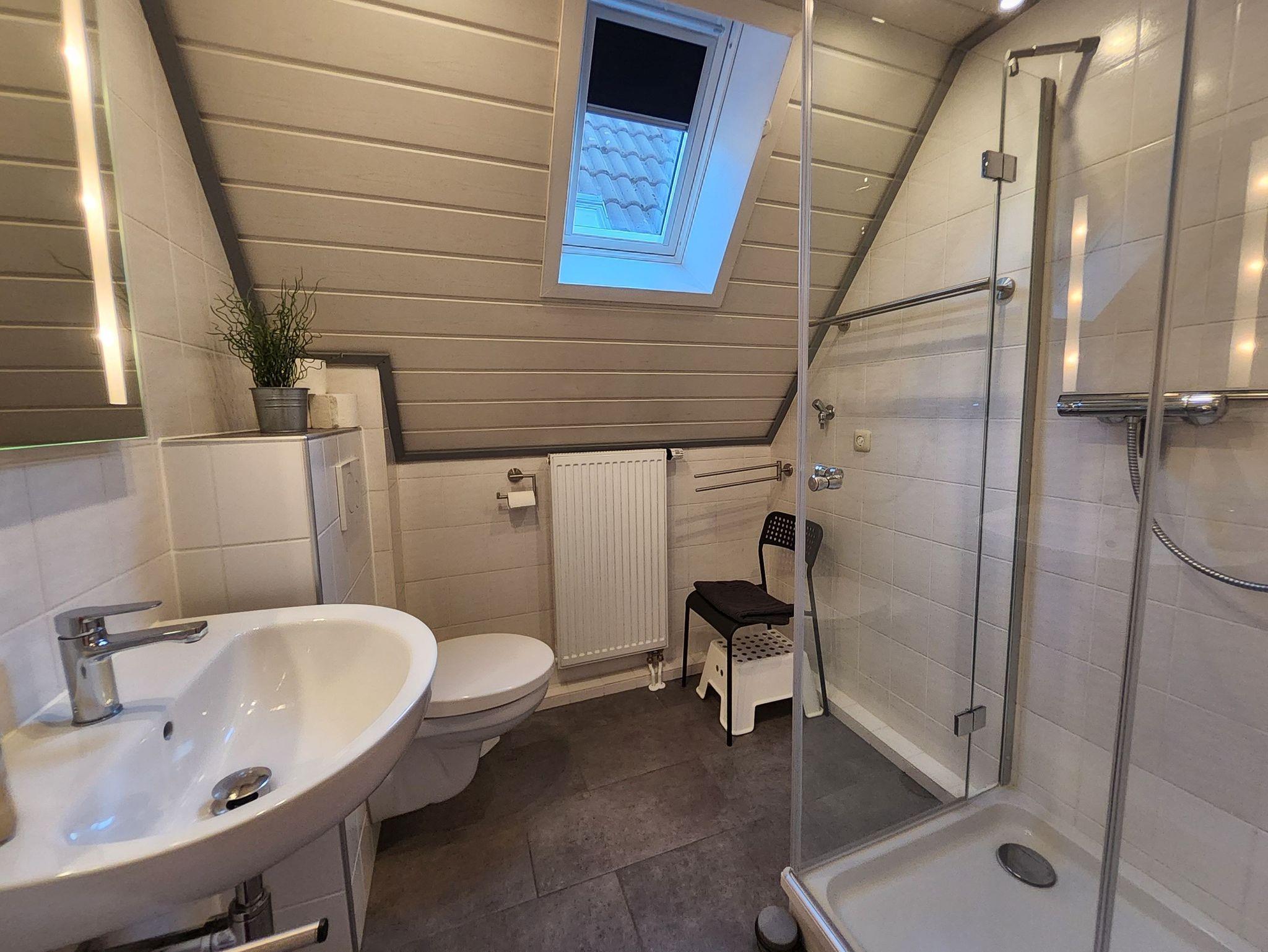 Auf der gleichen Etage befinden sich das Duschbad mit WC, ein großes Schlafzimmer mit Doppelbett (2,00 m x 1,80 m) sowie ein weiteres Schlafzimmer mit Einzelbett (2,00 m x 0,80 m).