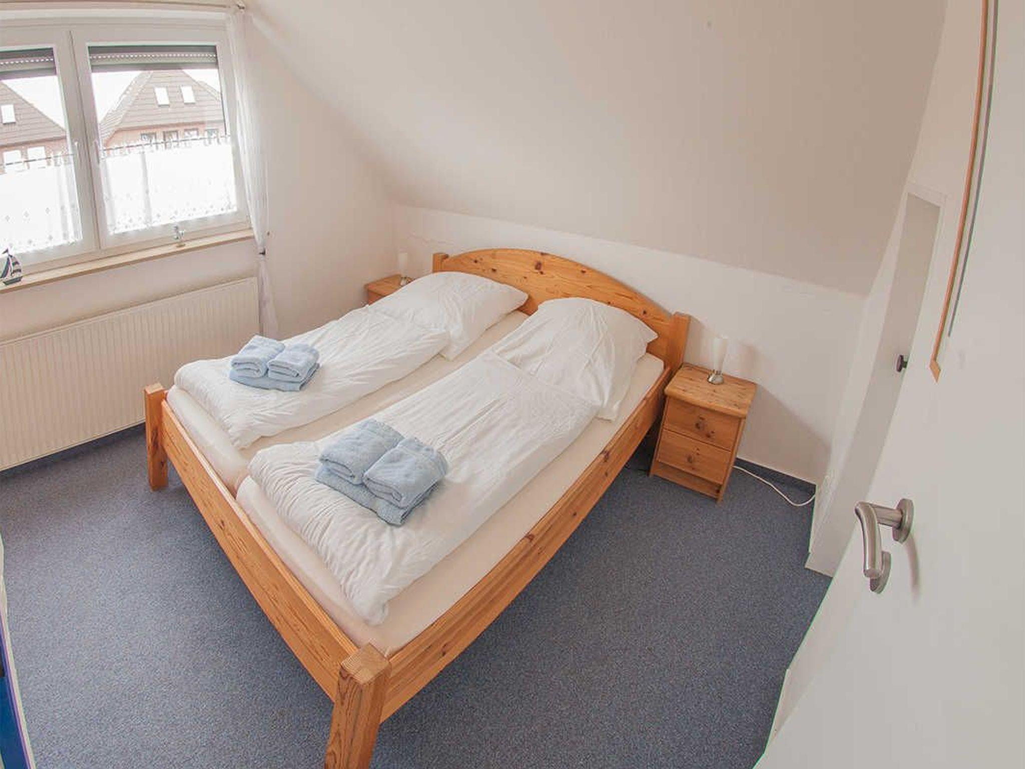 Im Obergeschoss liegt das helle Fensterduschbad mit Waschmaschine und die beiden Schlafräume mit Teppichboden: je ein Zimmer mit Doppelbett und ein Schlafraum mit ausziehbarem Tandembett.
