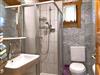 Badezimmer mit Dusche, WC und Waschtisch.