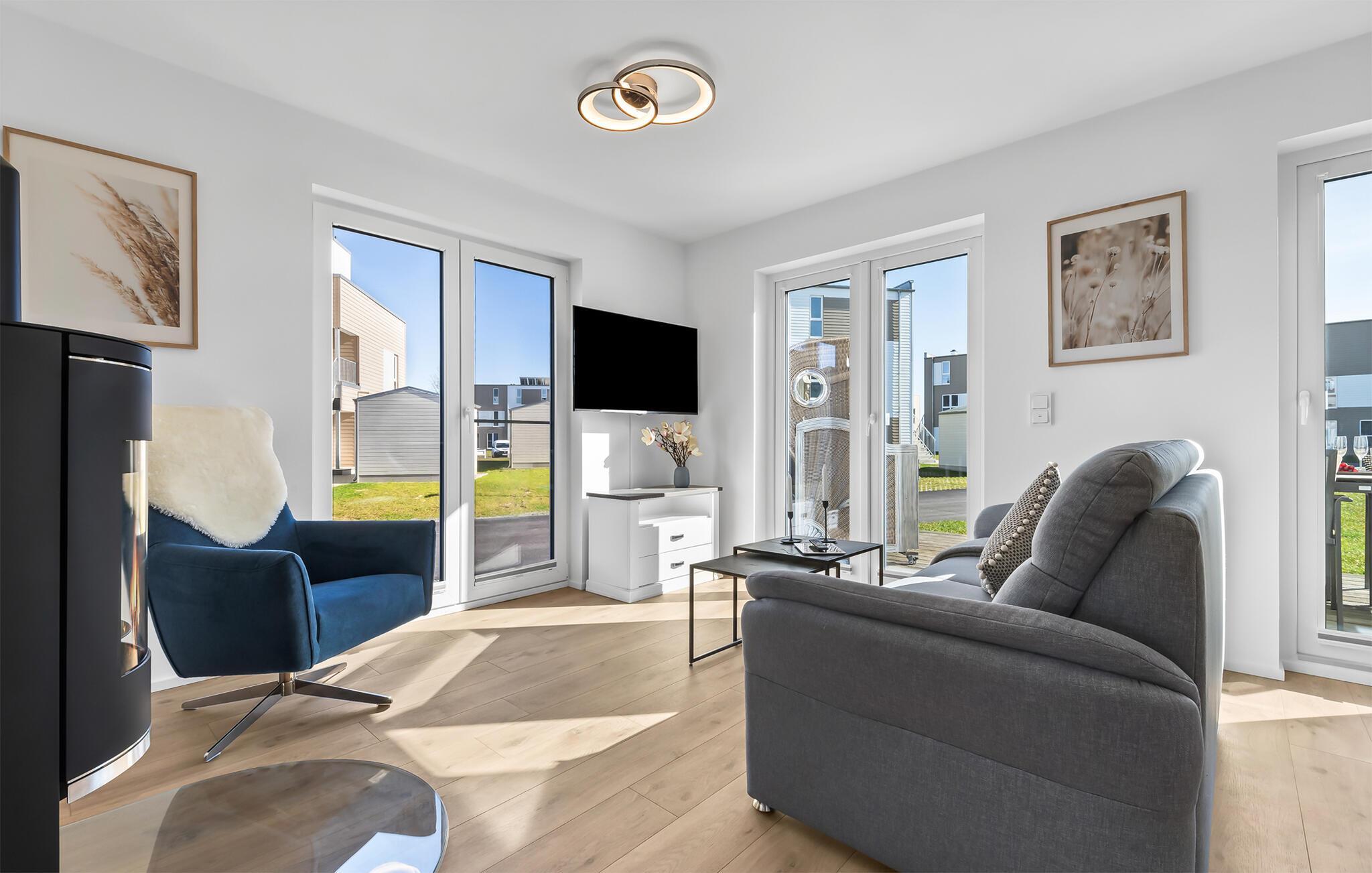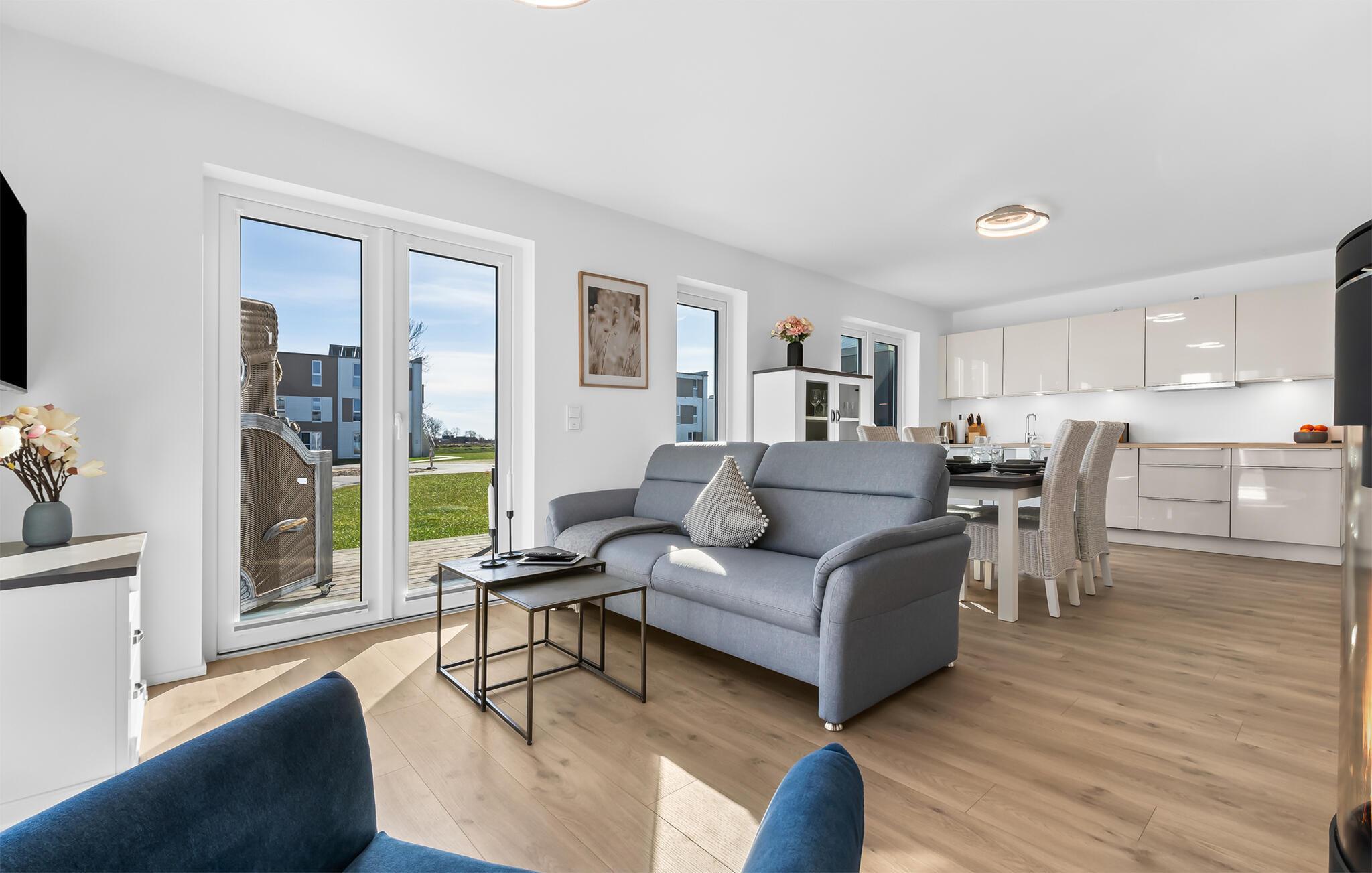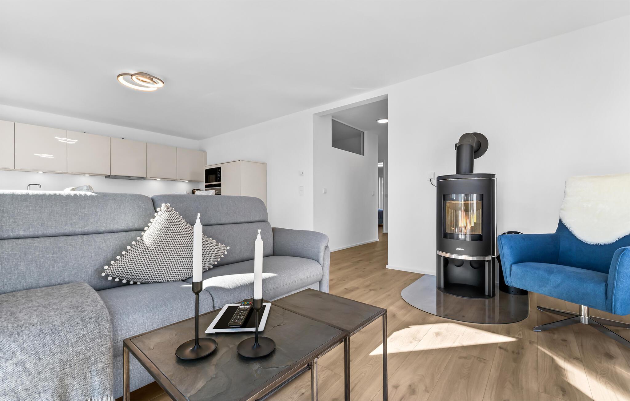 Das Herzstück der hochwertigen und modernen Wohnung sind der offene, lichtdurchflutete Wohn-/Essbereich und die perfekt ausgestattete Küche. Die blau und pastellfarbene Einrichtung sorgt für ein lässig-leichtes Gefühl und setzt viele gemütliche Stunden voraus. Mit der Top-Ausstattung der Küche, welche durch die Kitchenaid vervollständigt wird, macht gemeinsames Kochen besonders viel Spaß. Sollte sich das Wetter einmal von der nordischen Seite zeigen, lädt die Wohnlandschaft zur Entspannung ein. Der Kaminofen erzeugt mit seinem knisternden Feuer Gemütlichkeit.