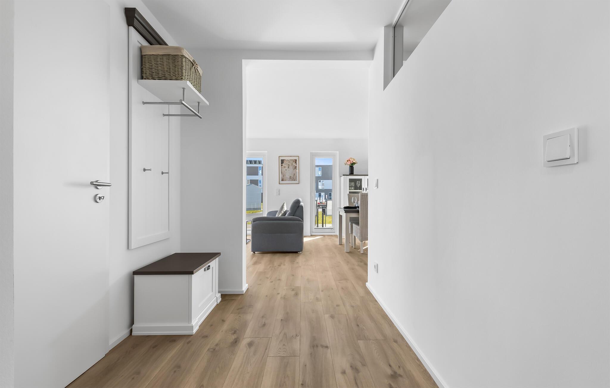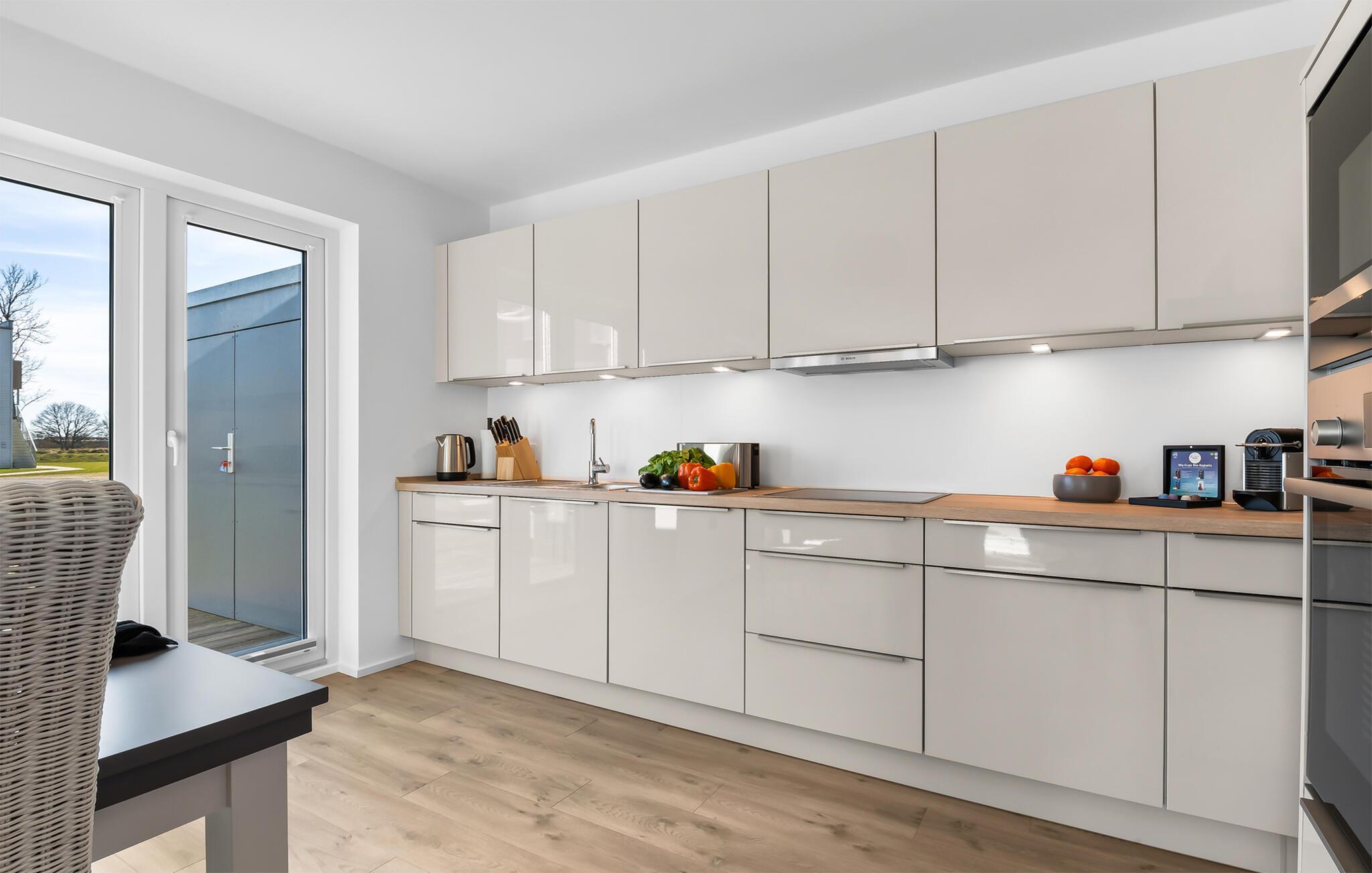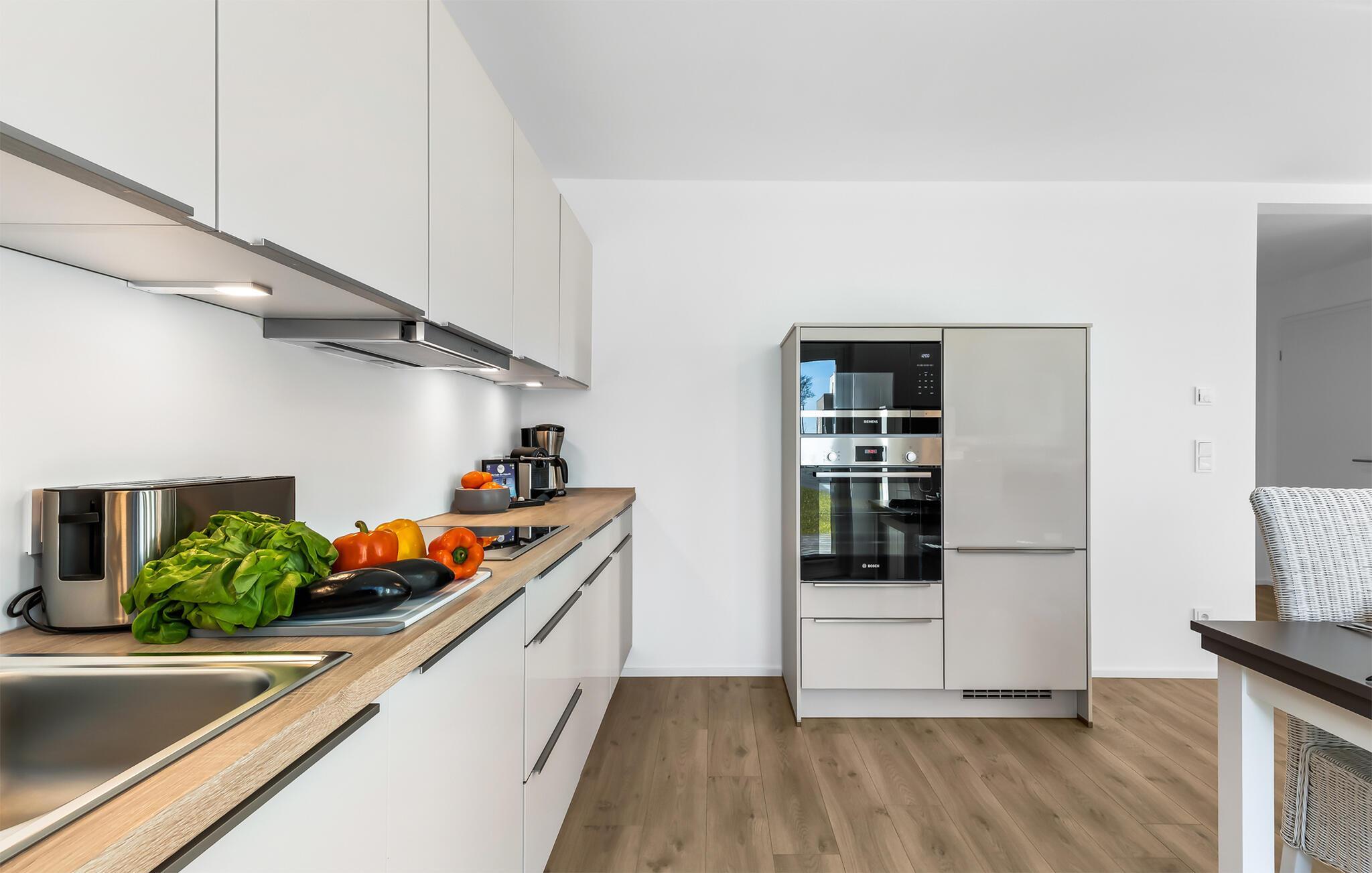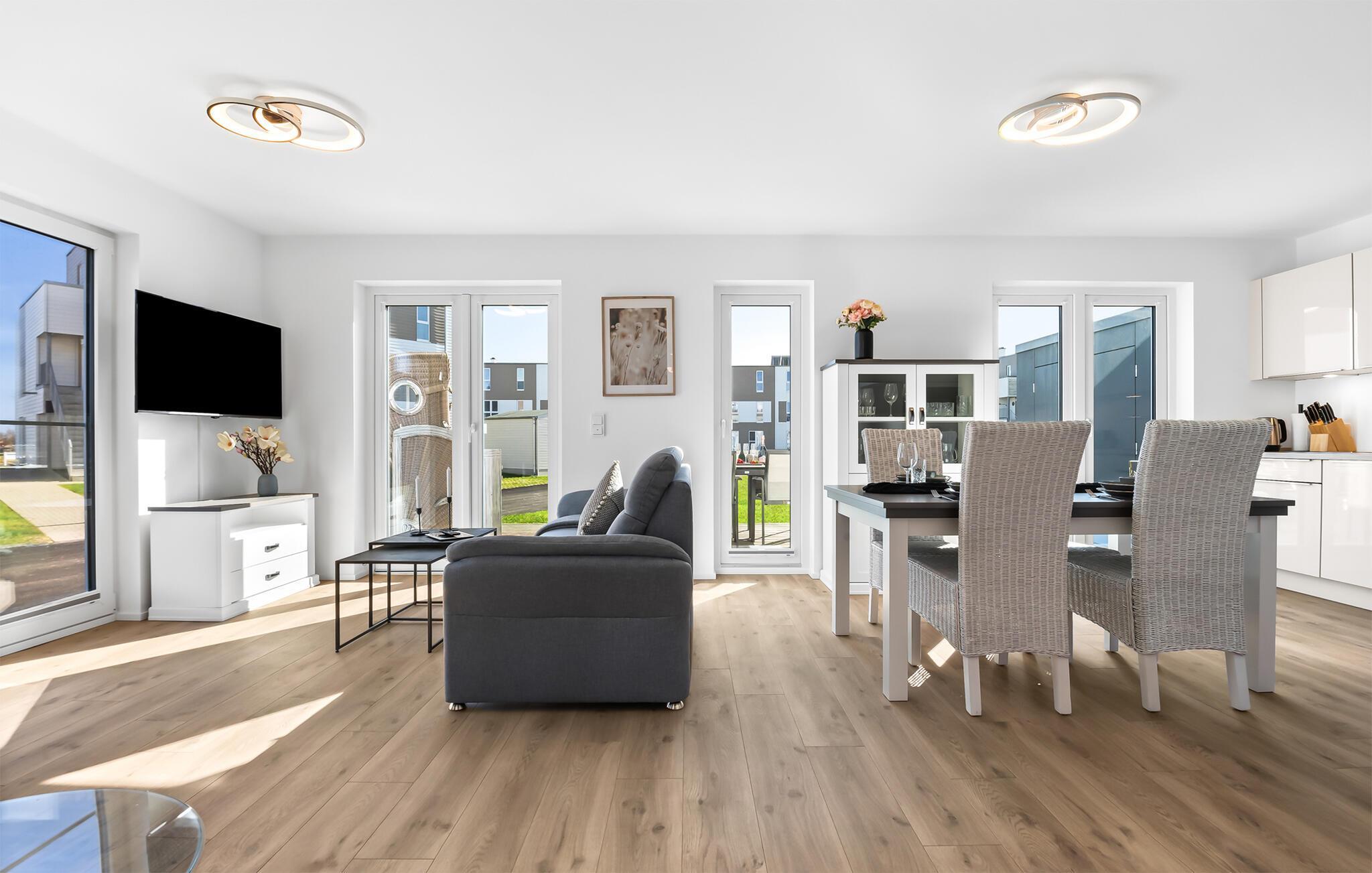 Das Herzstück der hochwertigen und modernen Wohnung sind der offene, lichtdurchflutete Wohn-/Essbereich und die perfekt ausgestattete Küche. Die blau und pastellfarbene Einrichtung sorgt für ein lässig-leichtes Gefühl und setzt viele gemütliche Stunden voraus. Mit der Top-Ausstattung der Küche, welche durch die Kitchenaid vervollständigt wird, macht gemeinsames Kochen besonders viel Spaß. Sollte sich das Wetter einmal von der nordischen Seite zeigen, lädt die Wohnlandschaft zur Entspannung ein. Der Kaminofen erzeugt mit seinem knisternden Feuer Gemütlichkeit.