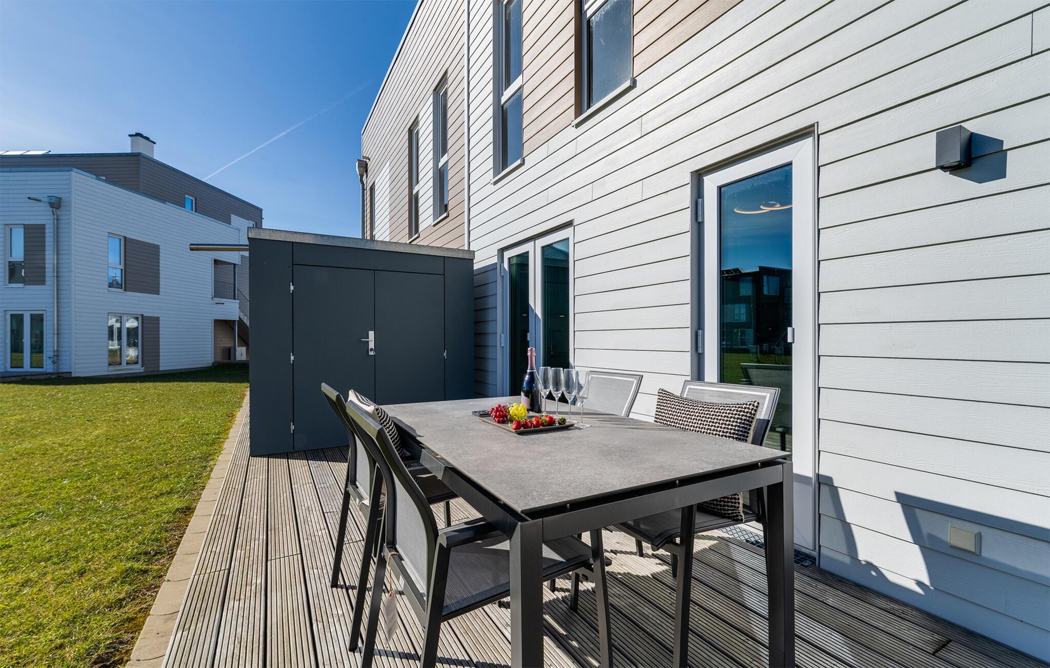 Direkt vom Wohnbereich aus betretet ihr die großzügige Terrasse mit Süd-Ausrichtung. Diese bietet ebenfalls erholsame Stunden fernab vom Trubel des Alltags direkt in der Natur. Nach hinten ausgerichtet mit Blick auf die Naturschutz-Salzwiesen und Felder genießt ihr die GARDEN VIEW. Die hochwertigen Möbel der Terrasse laden zum Grillen und Verweilen ein.