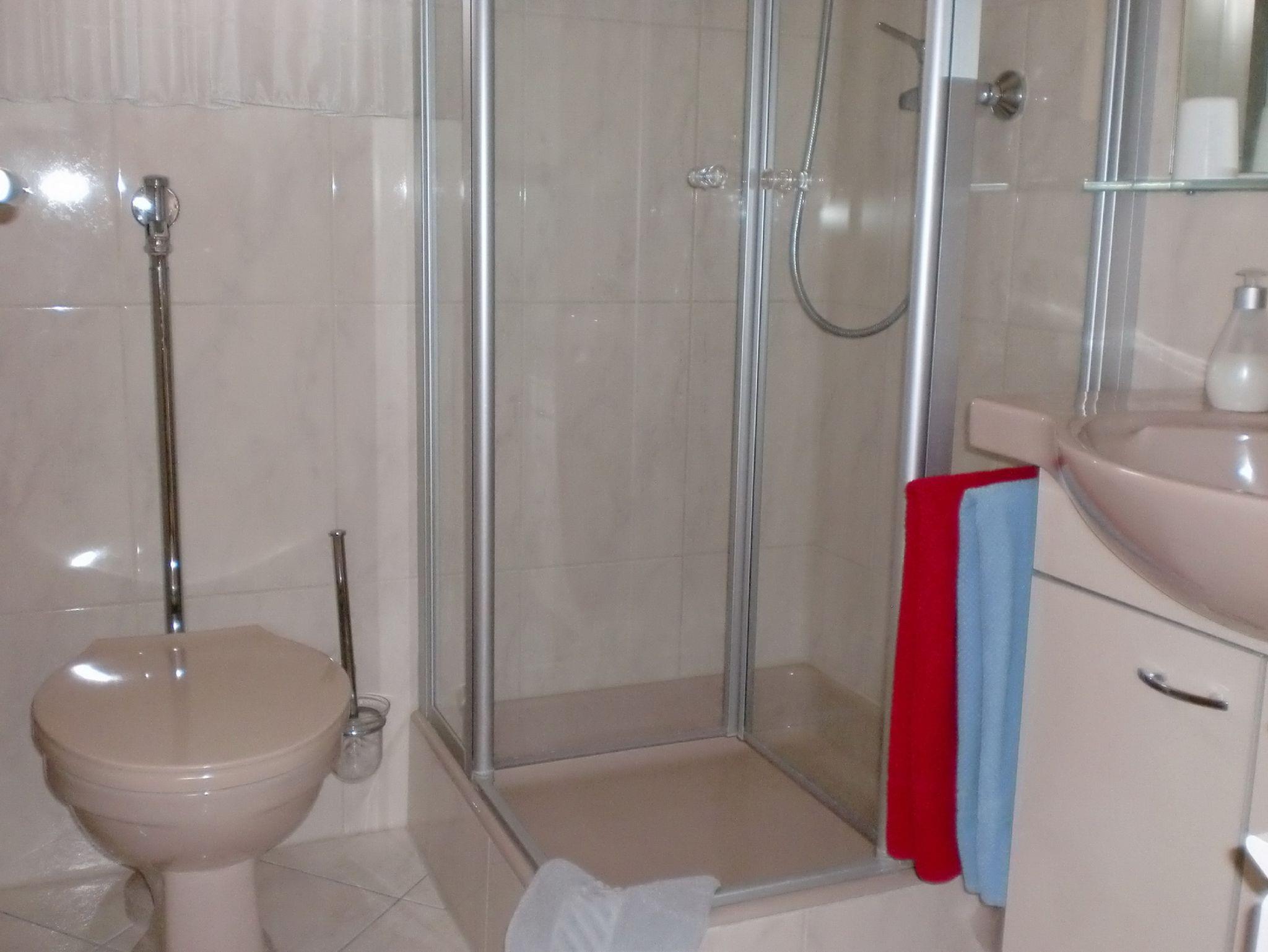 Im kleinen Duschbad befindet sich neben Dusche und WC ein bequemes Waschbecken mit großem beleuchteten Spiegel und ein Fenster zum Lüften.