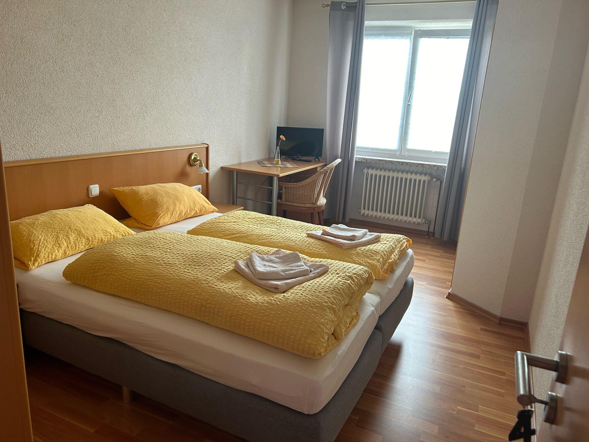 Das helle und freundliche Doppelzimmer mit 14,5 qm verfügt über zwei zusammengestellte Boxspringbetten, sowie einen Schreibtisch mit Stuhl und einen Kleiderschrank. Ausserdem bietet das Zimmer einen Flachbildfernseher sowie WLAN. Das Badezimmer verfügt über Dusche und WC. Handtücher und Bettwäsche stehen zur Verfügung.