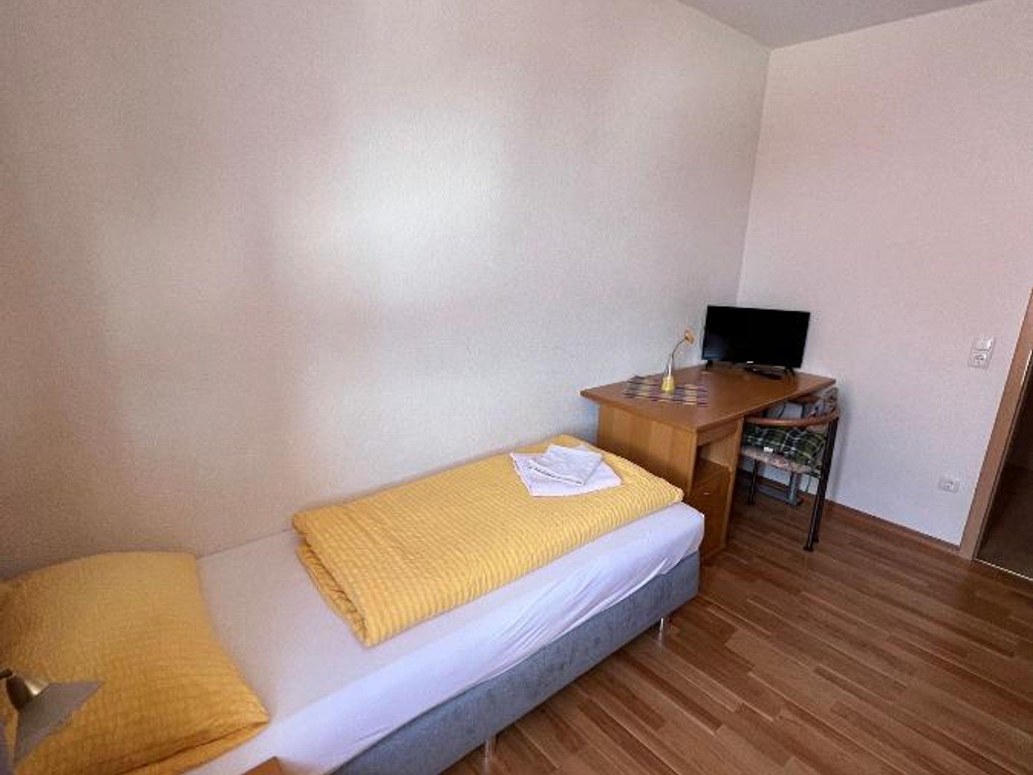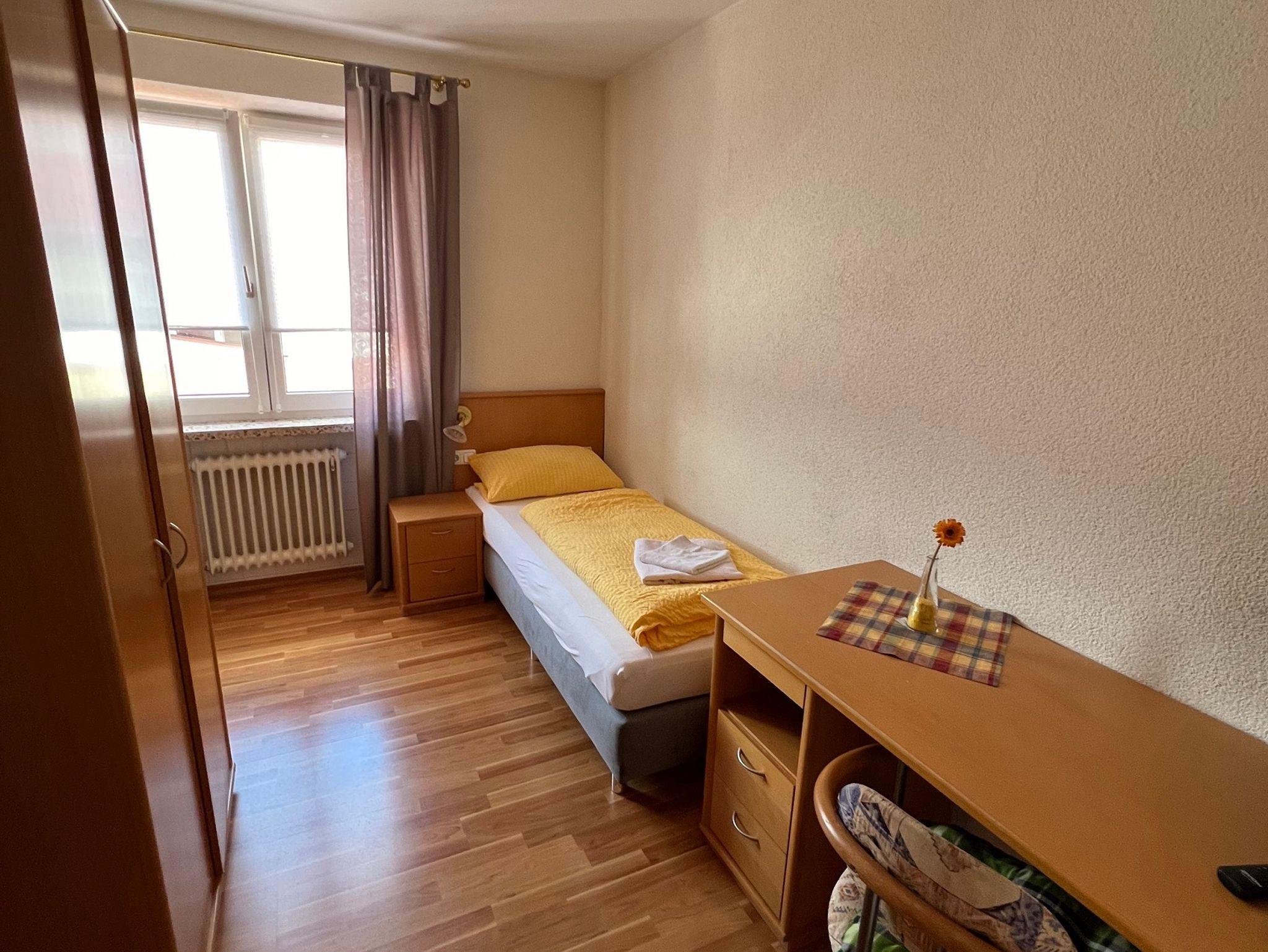 Das helle, freundliche Einzelzimmer mit 9 qm verfügt über ein Einzel Boxspringbett und einen Kleiderschrank sowie einen eigenen Flachbildfernseher, Schreibtisch mit Stuhl und WLAN. Das Badezimmer verfügt über Dusche und WC. Handtücher und Bettwäsche stehen zur Verfügung.