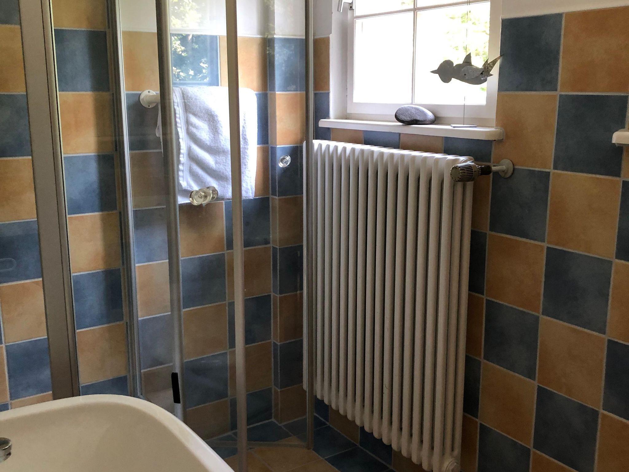 ein schönes Bad mit Dusche und Waschbecken, ein separates WC, sowie ein großes Schlafzimmer mit französischem Bett.