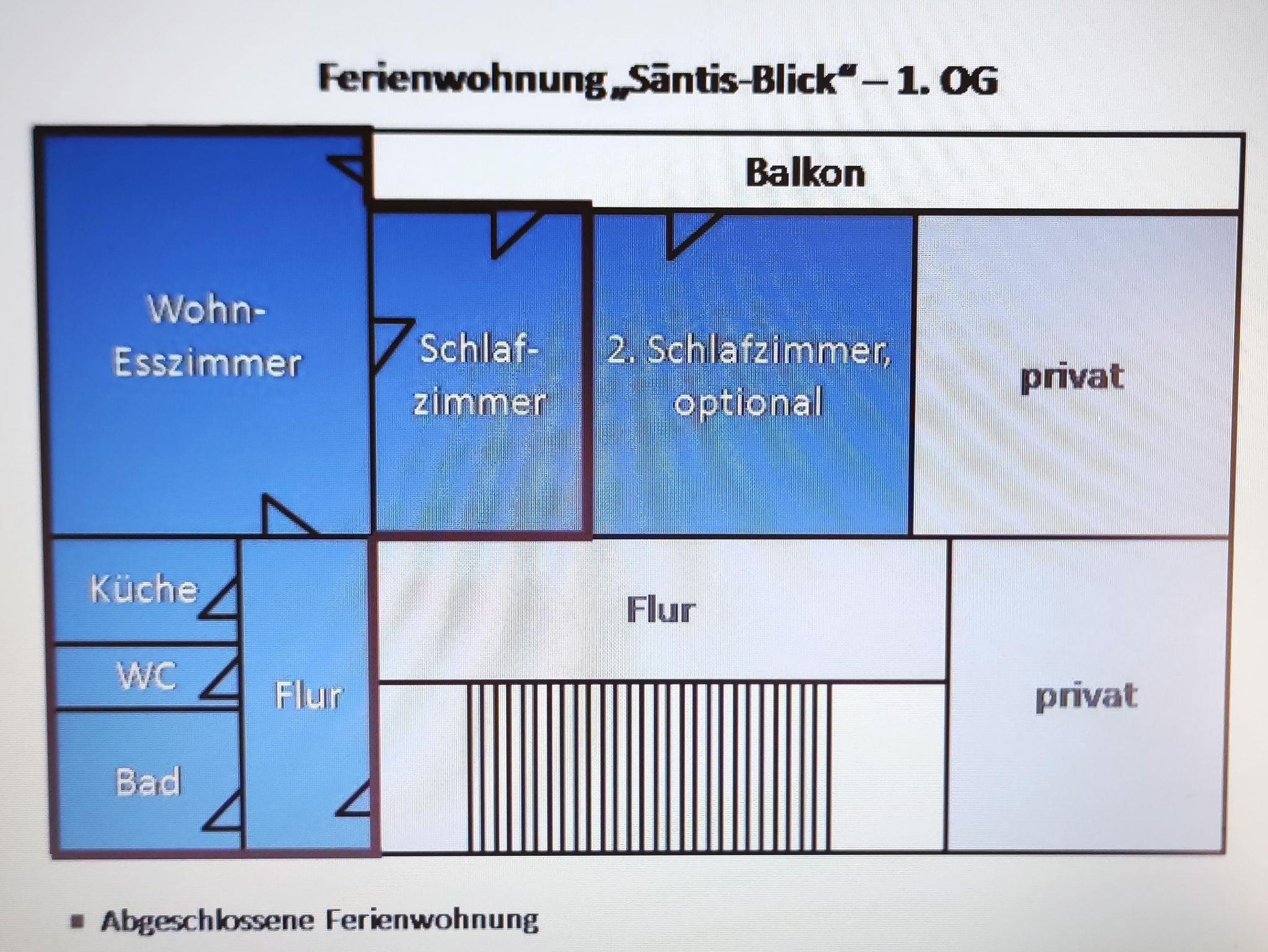 Die helle, gut ausgestattete Ferienwohnung Säntis-Blick *** befindet sich im 1. Obergeschoss unseres Hauses.