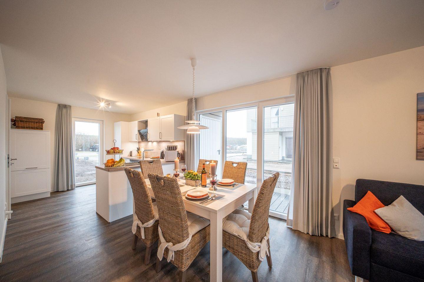 Durch einen charmanten Windfang gelangen Sie in den hellen, freundlichen Wohnbereich. Die offene Küche mit hochwertiger Ausstattung, inklusive Mikrowelle, lädt dazu ein, gemeinsam zu kochen und den großen Esstisch mit seinen sechs Stühlen zum Herzstück geselliger Stunden zu machen. Ein prasselnder Kaminofen sorgt dabei für wärmende Gemütlichkeit. Im hinteren Bereich finden Sie eine behagliche Sofaecke mit Fernseher – perfekt für entspannte Abende.