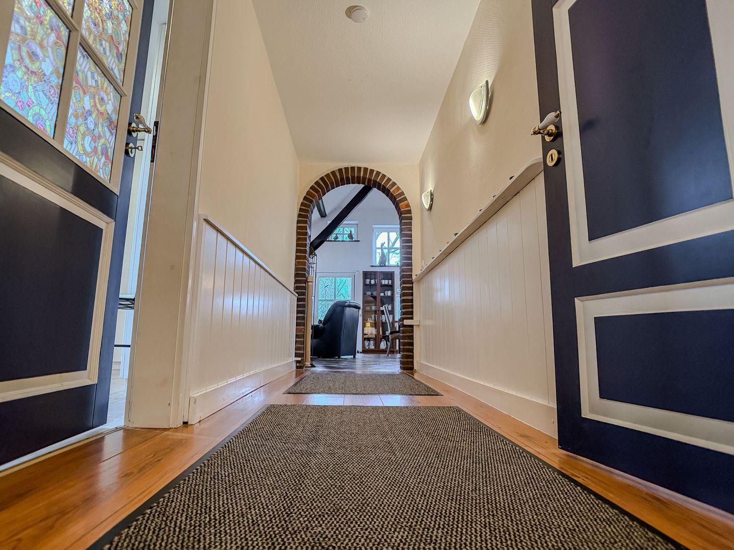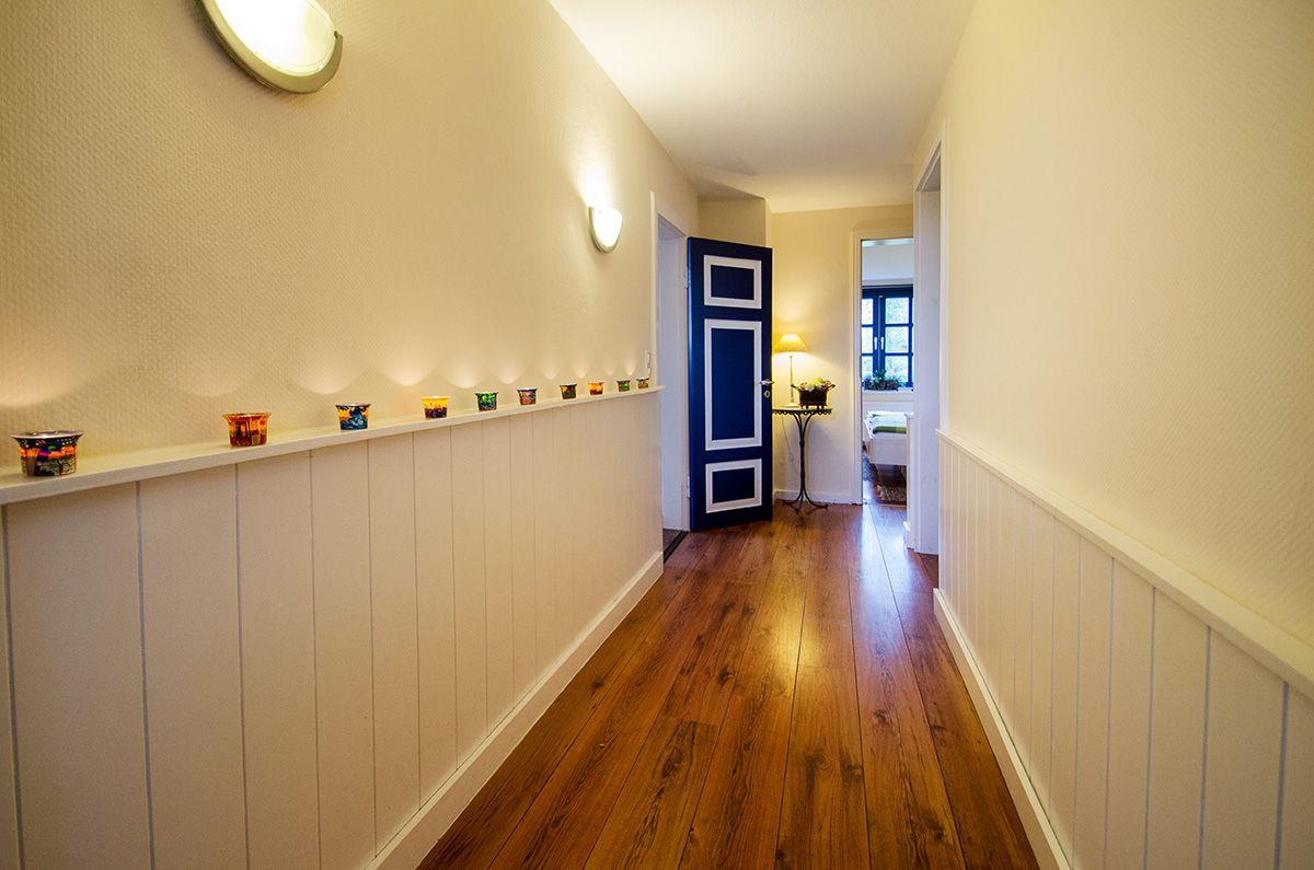 Beim Betreten des Hauses empfängt Sie ein langer, heller Flur mit weißen Wandverkleidungen und blauen Holztüren – das maritime Flair spüren Sie sofort.