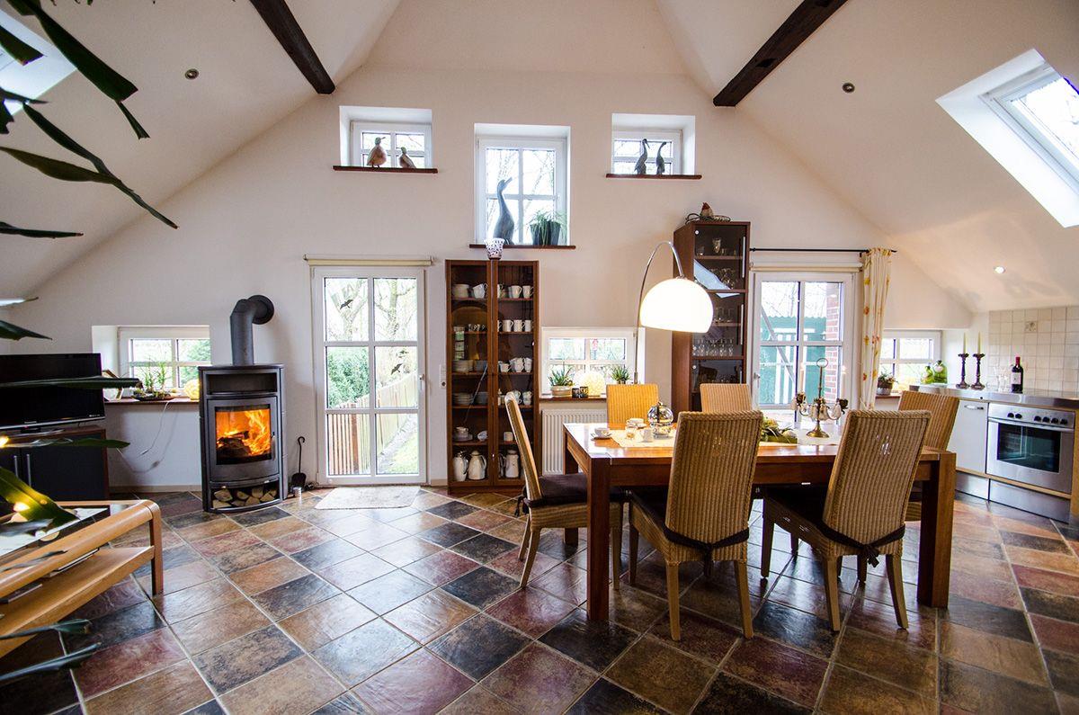 Die offene Gestaltung verbindet Küche, Wohn- und Essbereich zu einem Ort, an dem Sie gemeinsam kochen, essen oder einfach die Zeit genießen können. Alte dunkle Holzbalken und der knisternde Kamin verleihen dem Raum Wärme, Charakter und Gemütlichkeit.