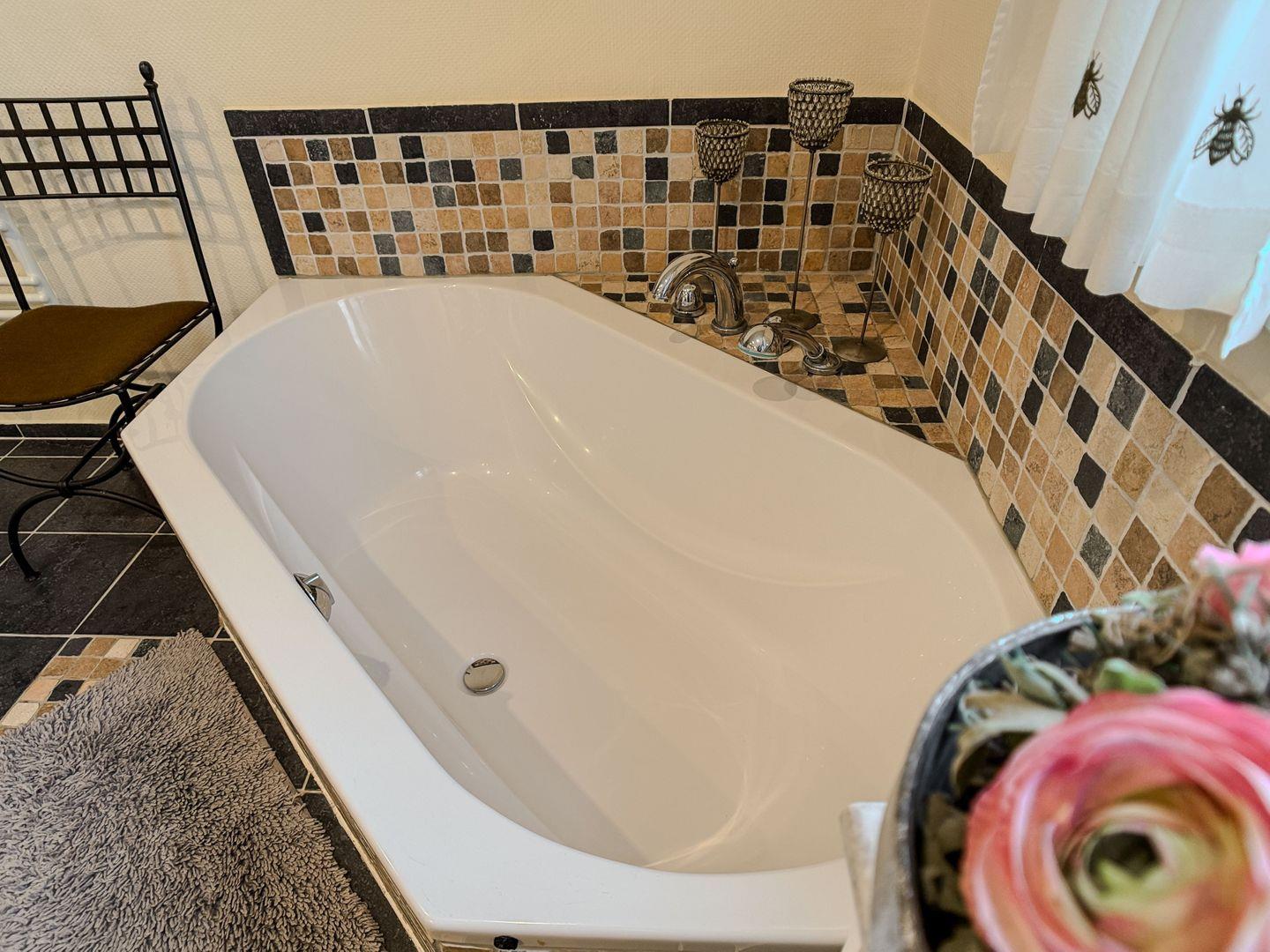 Das Badezimmer mit warmen Erdtönen verfügt über eine Badewanne und eine große bodengleiche Dusche.