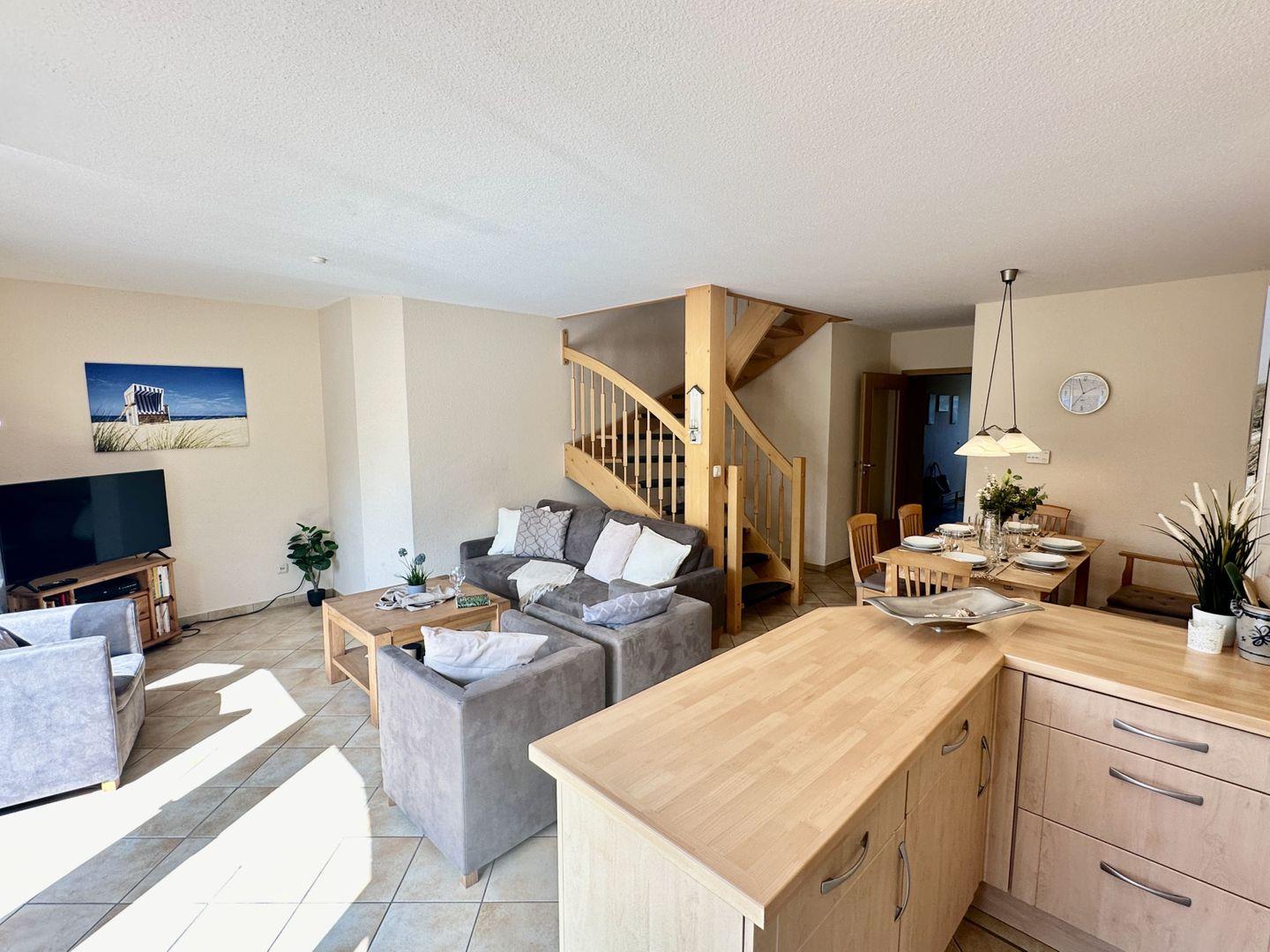 Schon beim Betreten des Hauses erwartet Sie ein lichtdurchflutetes, freundliches Wohnzimmer, das durch sein großes, rundes Fenster besticht. Hier werden Sie von der Morgensonne sanft geweckt, die Ihnen ins Gesicht scheint und für eine behagliche Atmosphäre sorgt. Die gemütliche Sofaecke und bequemen Sessel laden zu gemeinsamen TV-Abenden oder entspannten Lesestunden ein. Es ist ein Raum, der verbindet – egal, ob Sie zusammen Zeit verbringen oder jeder für sich Ruhe sucht.