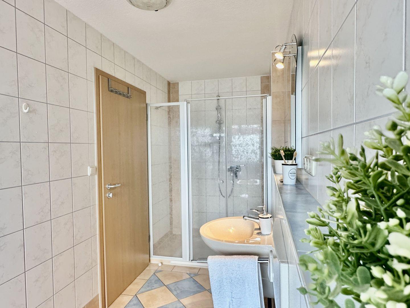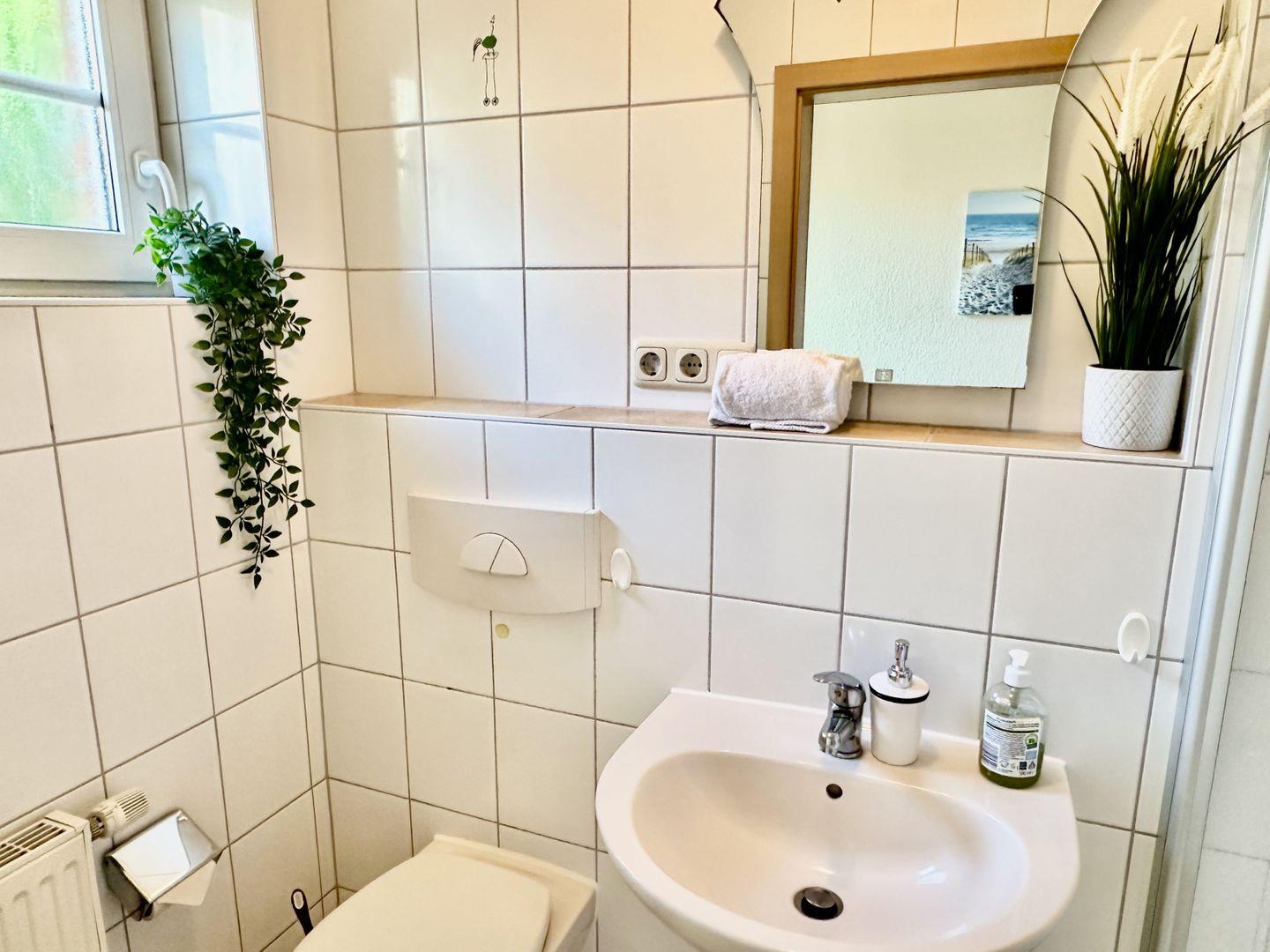 Die große, ebenerdige Dusche bietet Ihnen erfrischende Duscherlebnisse, während die Badewanne perfekt für entspannte Momente ist. Ob ein schneller Sprung unter die Dusche nach einem Strandtag oder ein wohltuendes Schaumbad am Abend – hier bleiben keine Wünsche offen.