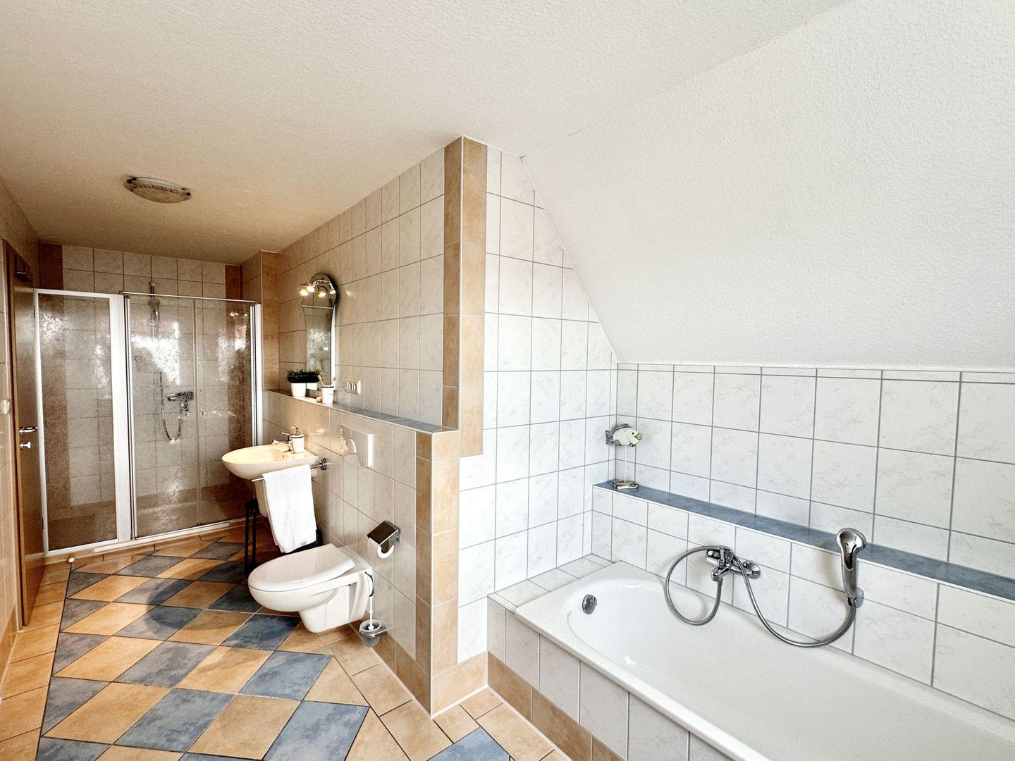 Auf dieser Etage befindet sich auch das zweite Badezimmer, das Sie mit seiner Größe und Ausstattung beeindrucken wird.