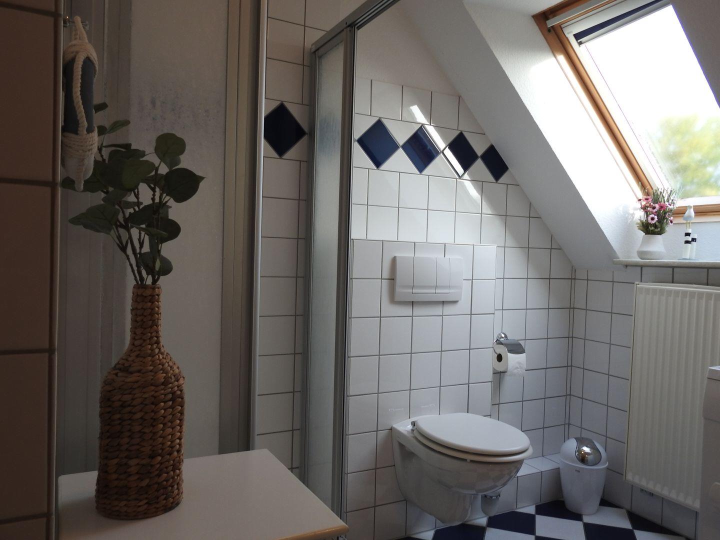 Das Badezimmer ist modern mit einer Dusche, Waschbecken, Waschmaschine (zur Eigennutzung) und Trockner ausgestattet. Ein Staubsauger sowie Bügelbrett und Bügeleisen stehen zur Verfügung, sodass auch längere Aufenthalte komfortabel gestaltet werden können.