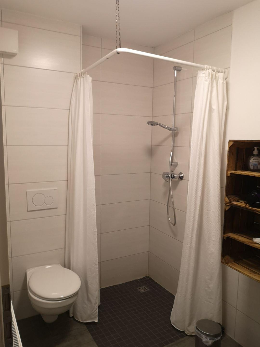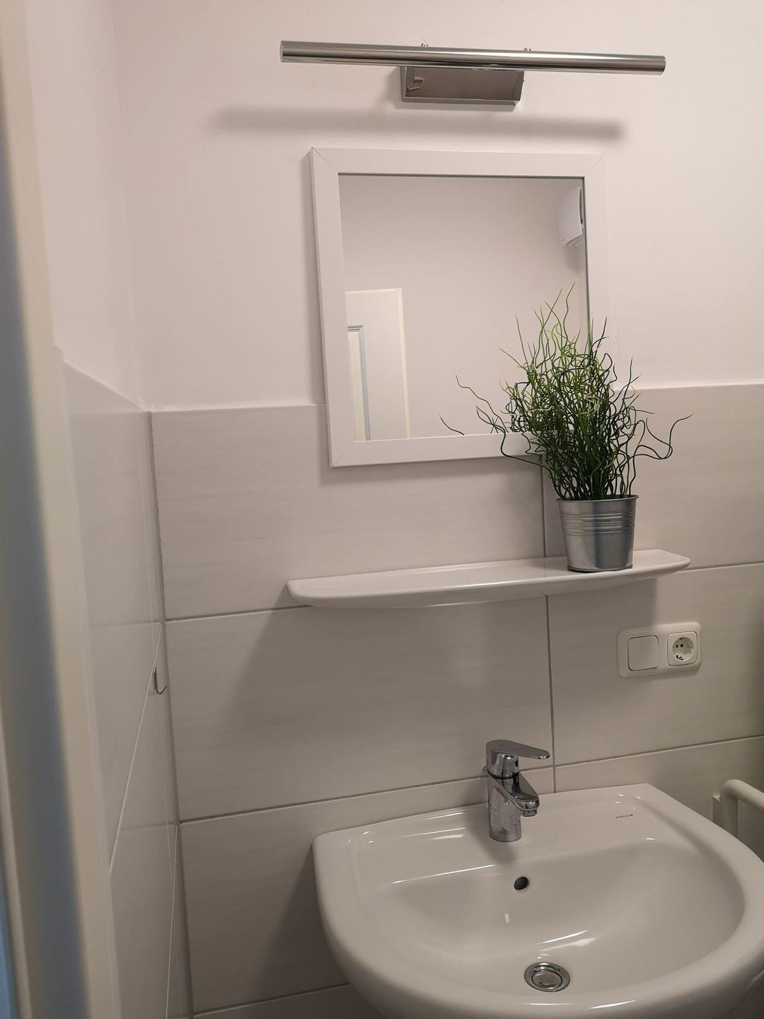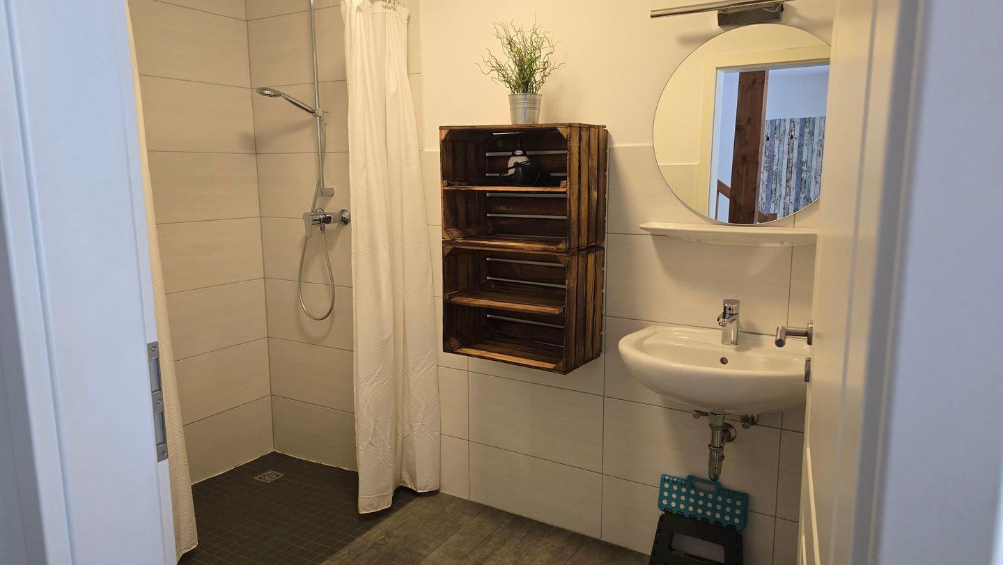 Über zwei Etagen verteilen sich insgesamt drei Räume, darunter ein freundlich gestaltetes Wohnzimmer mit Laminatboden und gemütlicher Sofaecke. Ebenfalls vorhanden ist ein separater Essbereich mit Esstisch, der zum gemeinsamen Speisen und Beisammensein einlädt. Die Ferienwohnung verfügt über zwei moderne Badezimmer, beide mit bodengleichen Duschen ausgestatten.