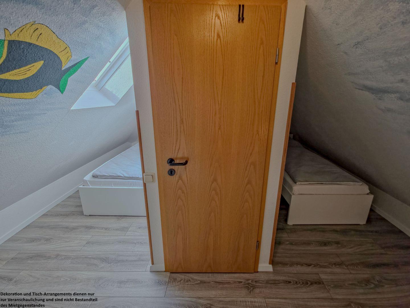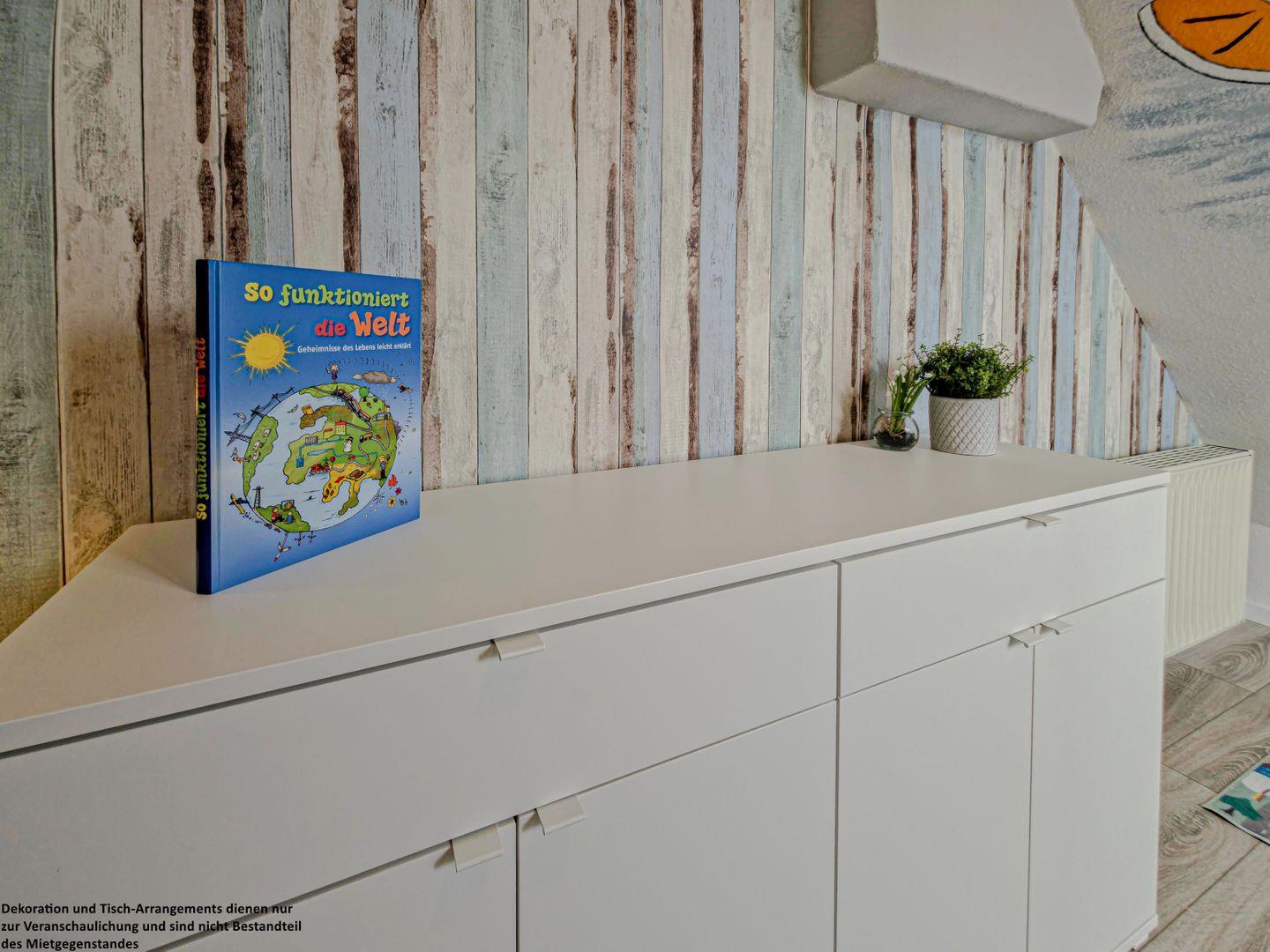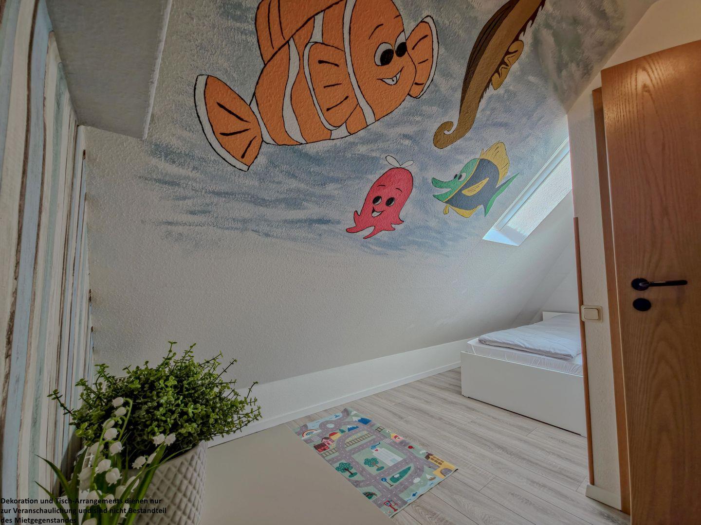 Im zweiten Schlafzimmer beginnt ein kleiner Traum für die Kinder: Liebevoll gestaltete Wände mit bunten Malereien, ein freundlicher Nemo, der über die Kleinen wacht, zwei Einzelbetten (90?x?200?cm), Dachfenster und behagliche Schräge schaffen eine geborgene Atmosphäre, in der die Kleinen sich rundum wohlfühlen.