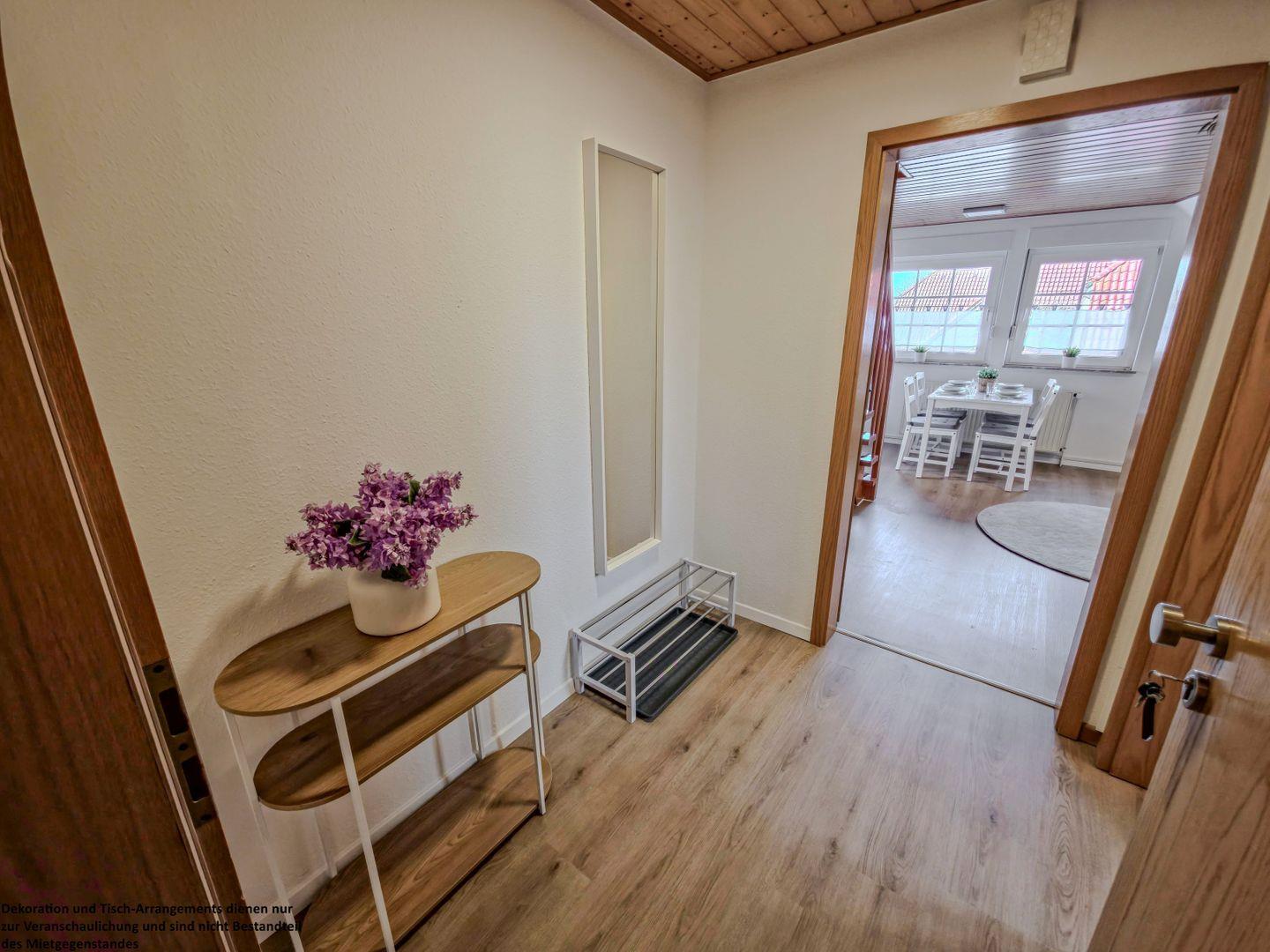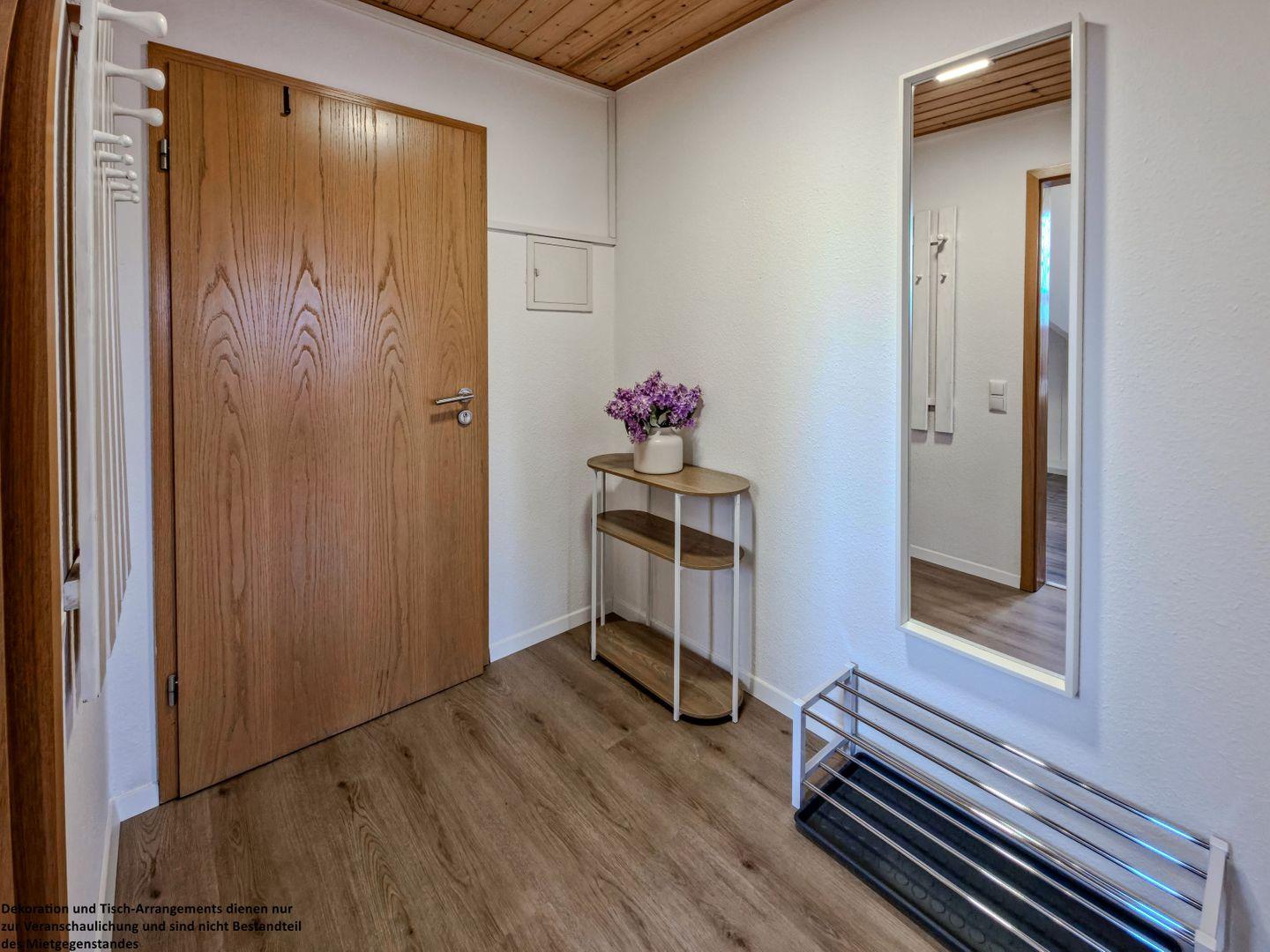 Schon beim Betreten empfängt Sie der geräumige Flur: Mit Garderobe, Ganzkörperspiegel und praktischem Schuhregal finden Ihre Kleidung und Schuhe ausreichend Platz – hier beginnt Ihr Aufenthalt voller Komfort und Ruhe.