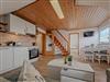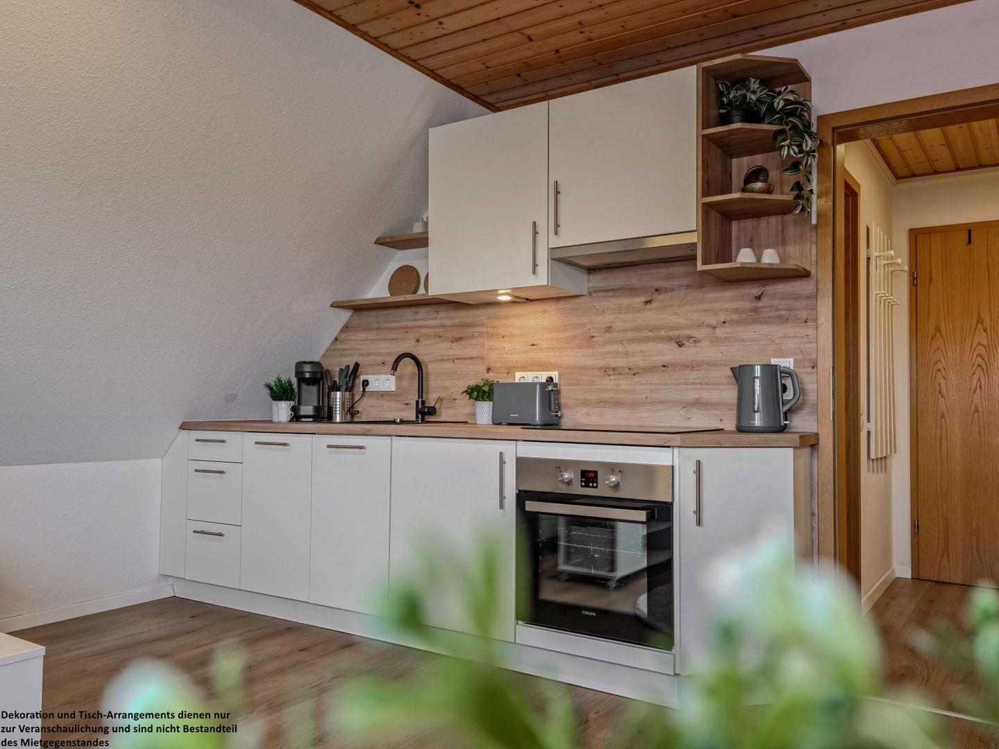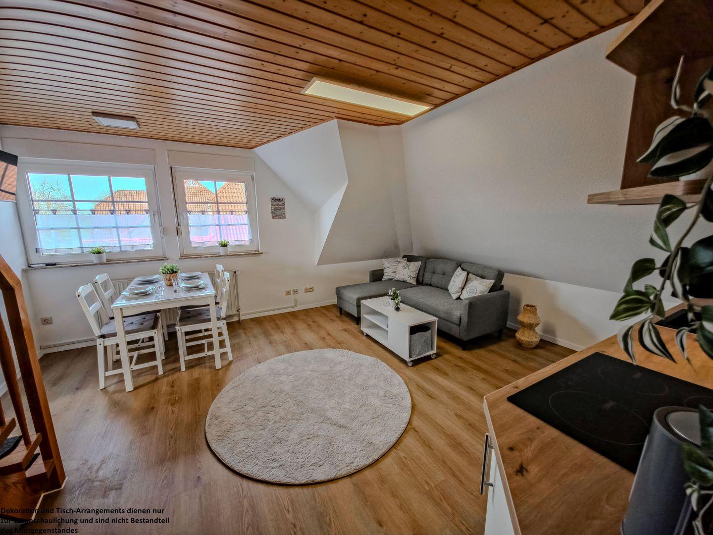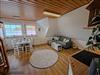 Von dort gelangen Sie in das gemütliche Wohnzimmer, das durch seine helle Holzdecke und sanfte Schräge eine einladende Atmosphäre schafft. Auf dem bequemen Sofa können Sie gemeinsame Stunden vor dem TV genießen, während die angrenzende Eßgruppe genug Platz für gemütliche Mahlzeiten oder spannende Spieleabende bietet. Die offene Küche im Wohnbereich ist mit allem ausgestattet, was Sie für die Selbstversorgung benötigen – kochen, lachen und genießen Sie in entspannter Runde.