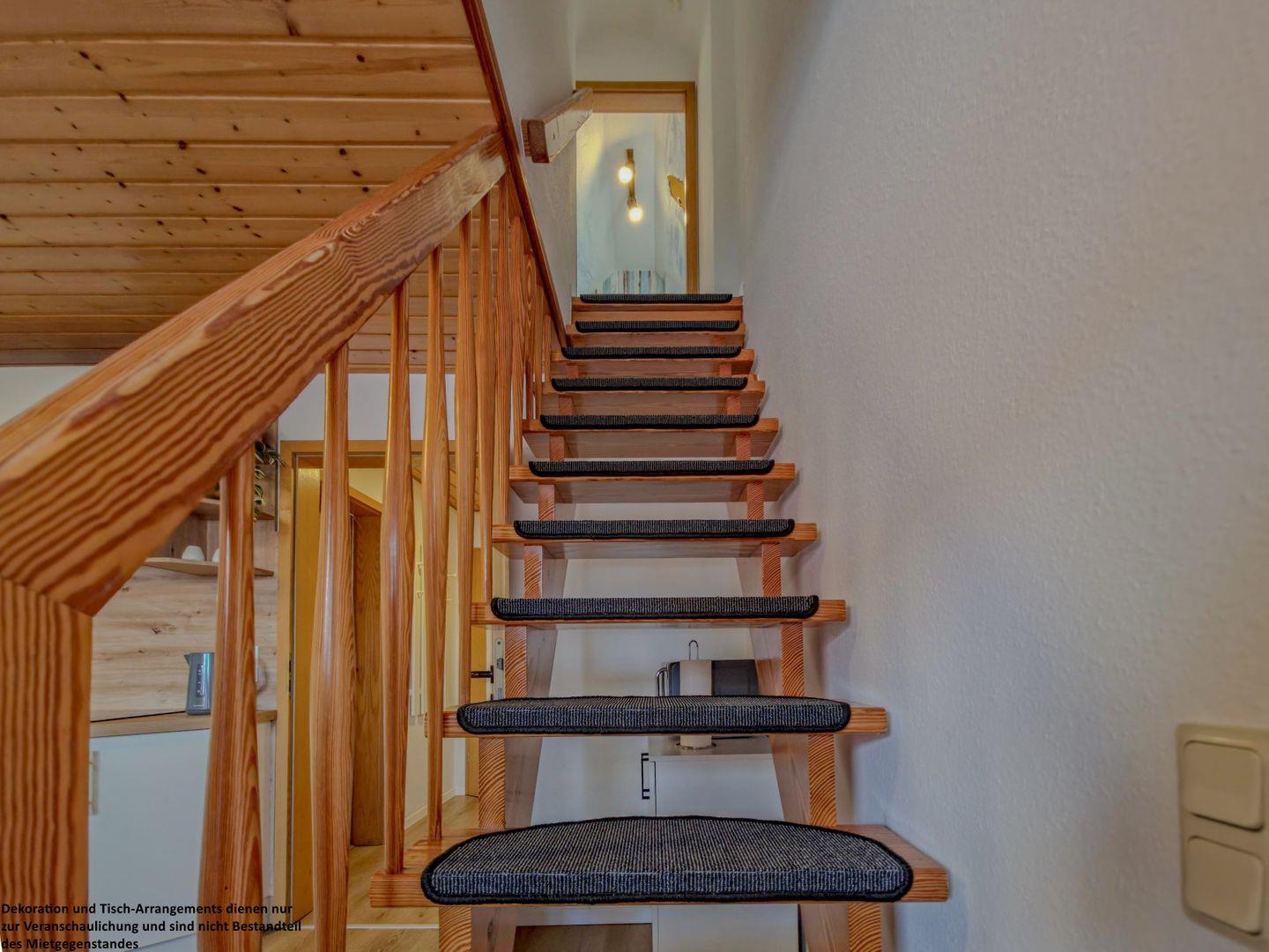 Über eine Holztreppe gelangen Sie in die obere Etage, in der sich die beiden Schlafzimmer befinden: