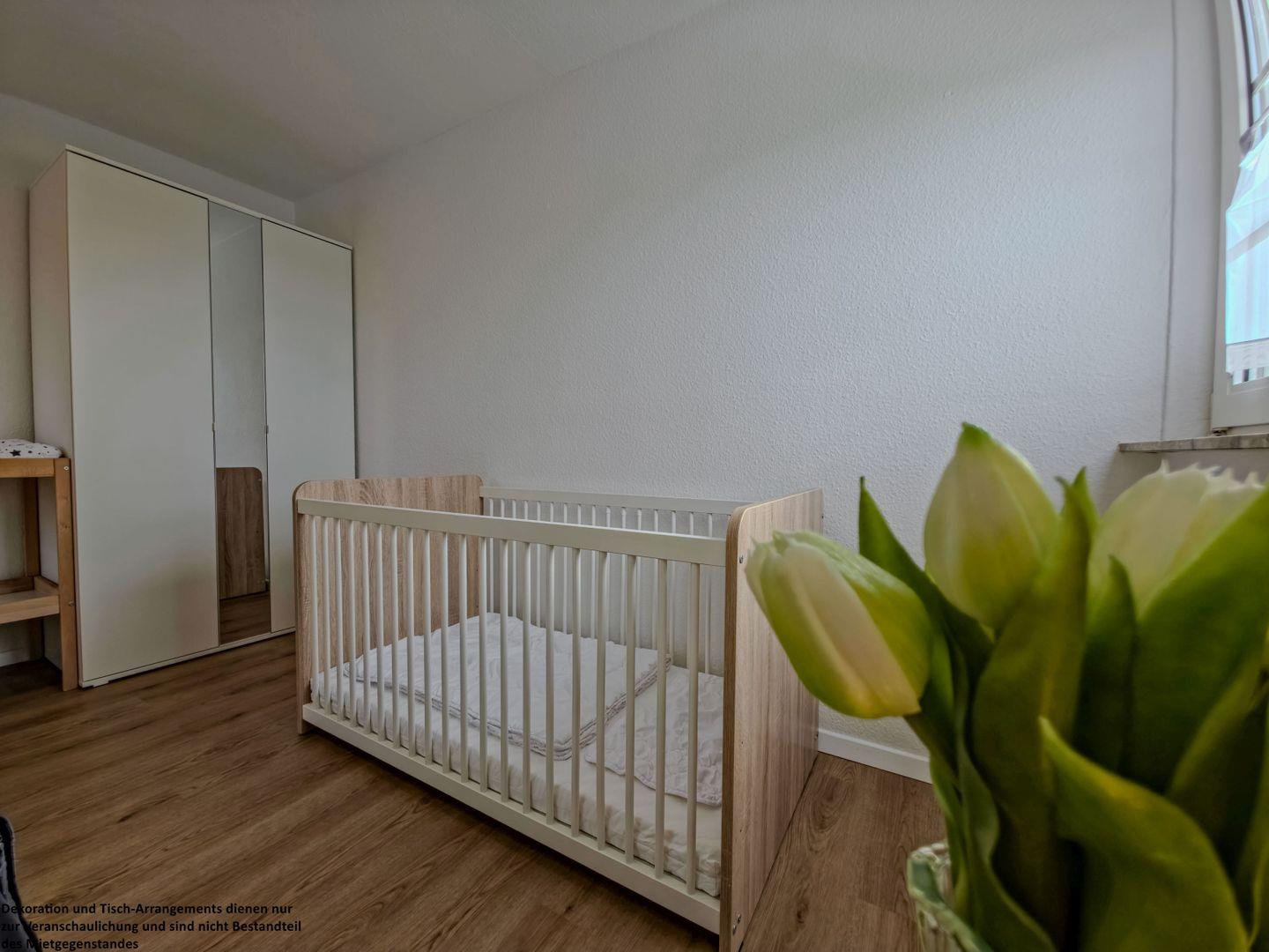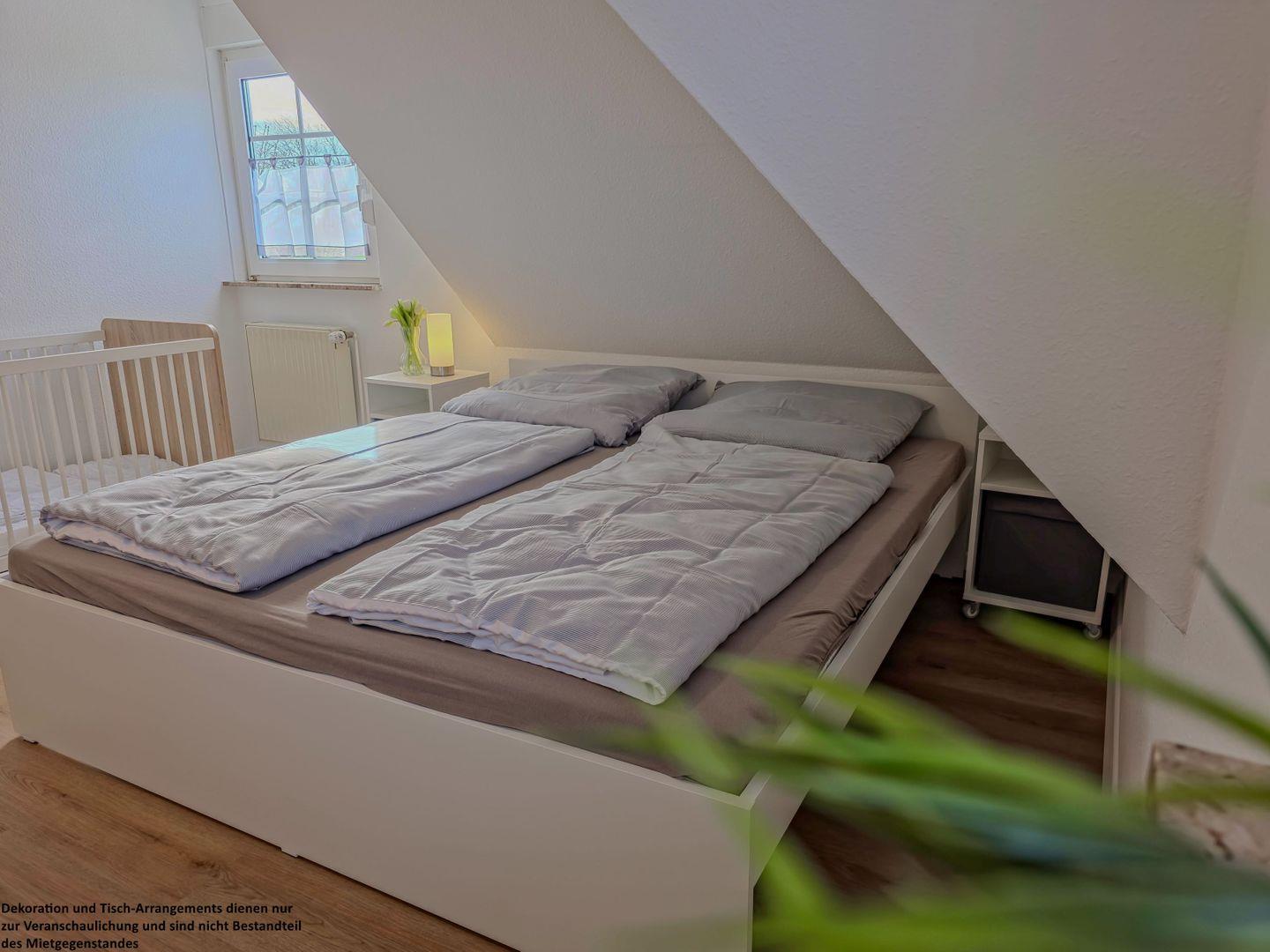 Im großen Schlafzimmer erwartet Sie ein 180?x?200?cm großes Bett mit einzelnen Matratzen für erholsamen Schlaf. Ein Holzbabybett steht für die Kleinsten bereit, während ein geräumiger Kleiderschrank genügend Stauraum bietet.