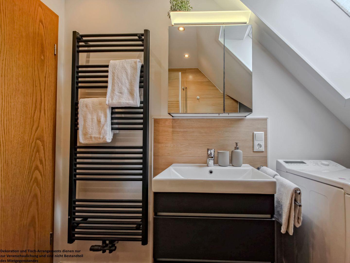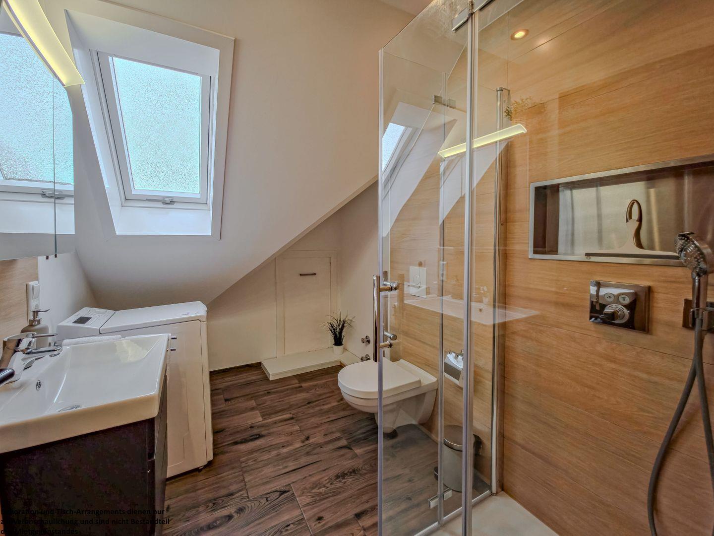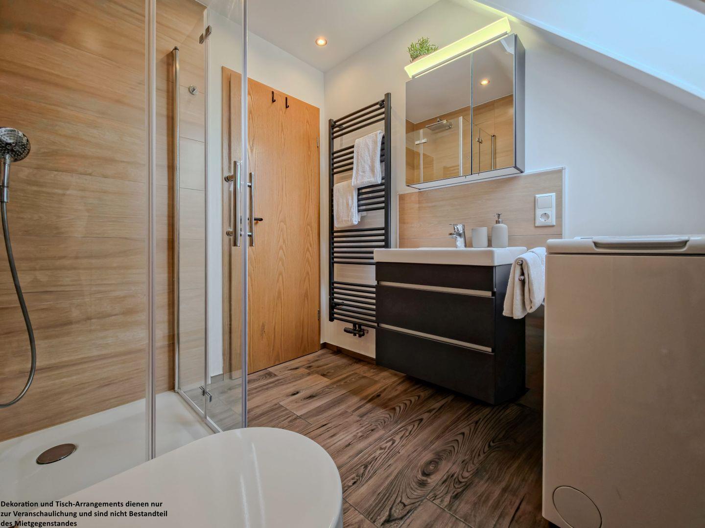 Das Badezimmer besticht durch warme, braune Farbakzente und bietet eine große Dusche, einen geräumigen Unterschrank für Ihre Pflegeutensilien und eine Waschmaschine, die zusätzlichen Komfort während Ihres Aufenthalts garantiert.