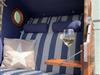 Eine großzügiger, möblierter und überdachter Balkon, direkt über der Graft, lädt zum Verweilen ein. Ein Strandkorb rundet hier das friesische Bild ab.
