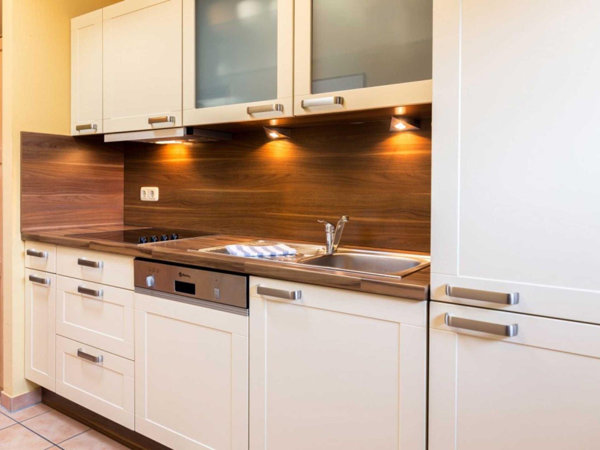 Mit kompett ausgestatteter Küche mit Spülmaschine, Kühl- und Gefrierkombi, 4 Kochplatten, Mikrowelle, Kaffeemaschine, Wasserkocher.