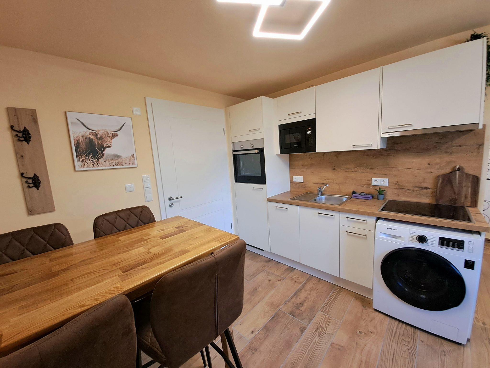 Unsere Ferienwohnung(Neubau2024) ist ein gemütliches ein Zimmerappartement bestehend aus einer vollausgestatteten Küche mit Spülmaschine, einem modernen Hochtisch mit Hochstühlen, einem französischen Bett und einer Schlafcouch, Flachbild TV, kostenlosen WLAN und LAN-Anschluss. Das Badezimmer hat eine begehbare Dusche und einen großen Spiegel. Handtücher und Bettwäsche sind inkludiert. Die Ferienwohnung ist über eine Außentreppe begehbar, direkt von den Parkplätzen (kostenlos). Sie liegt auf einem landwirtschaftlichen Anwesen.