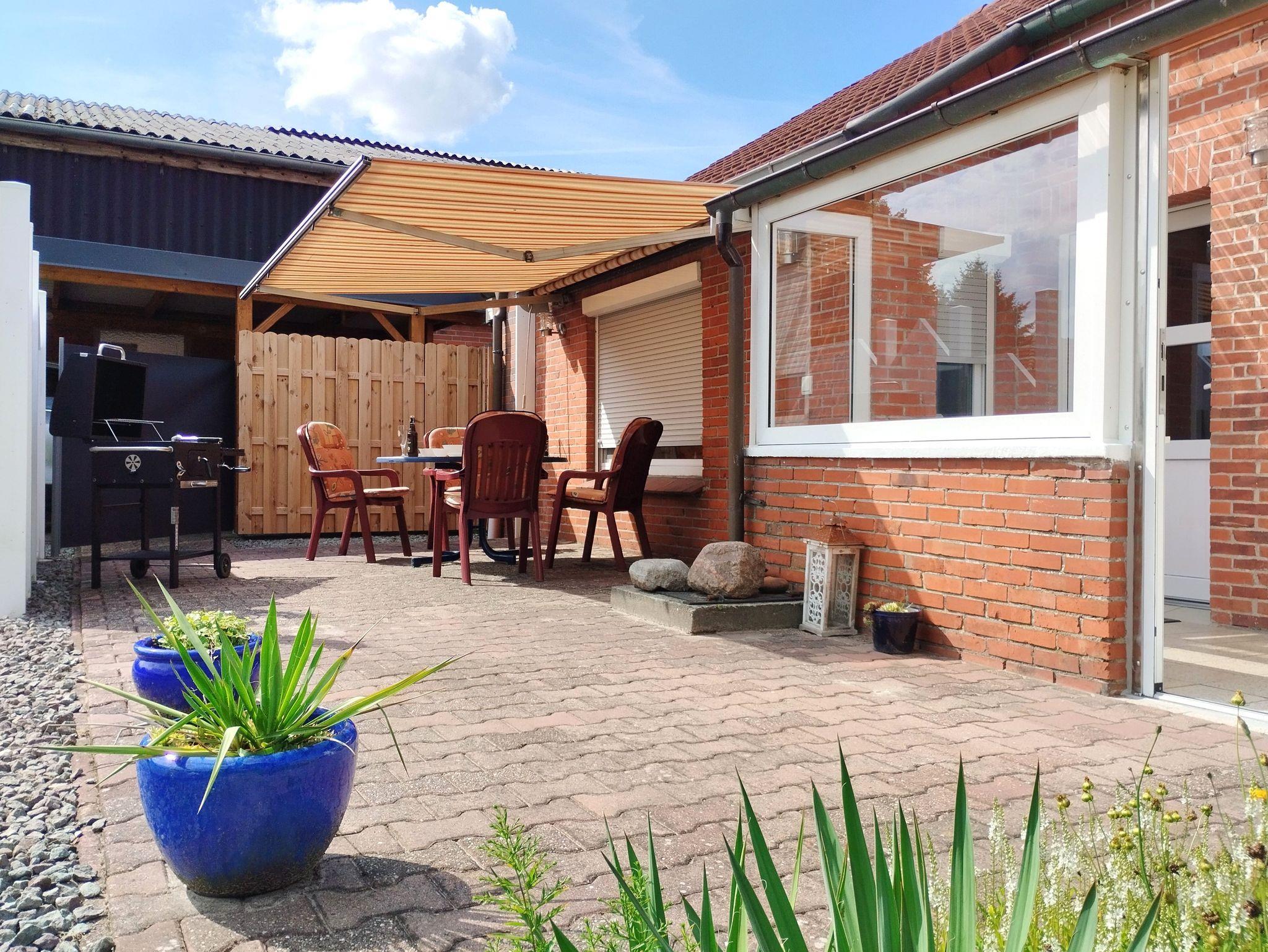 Die große Terrasse mit Markise und Blick auf den Garten lädt zum Verweilen und Grillen ein.