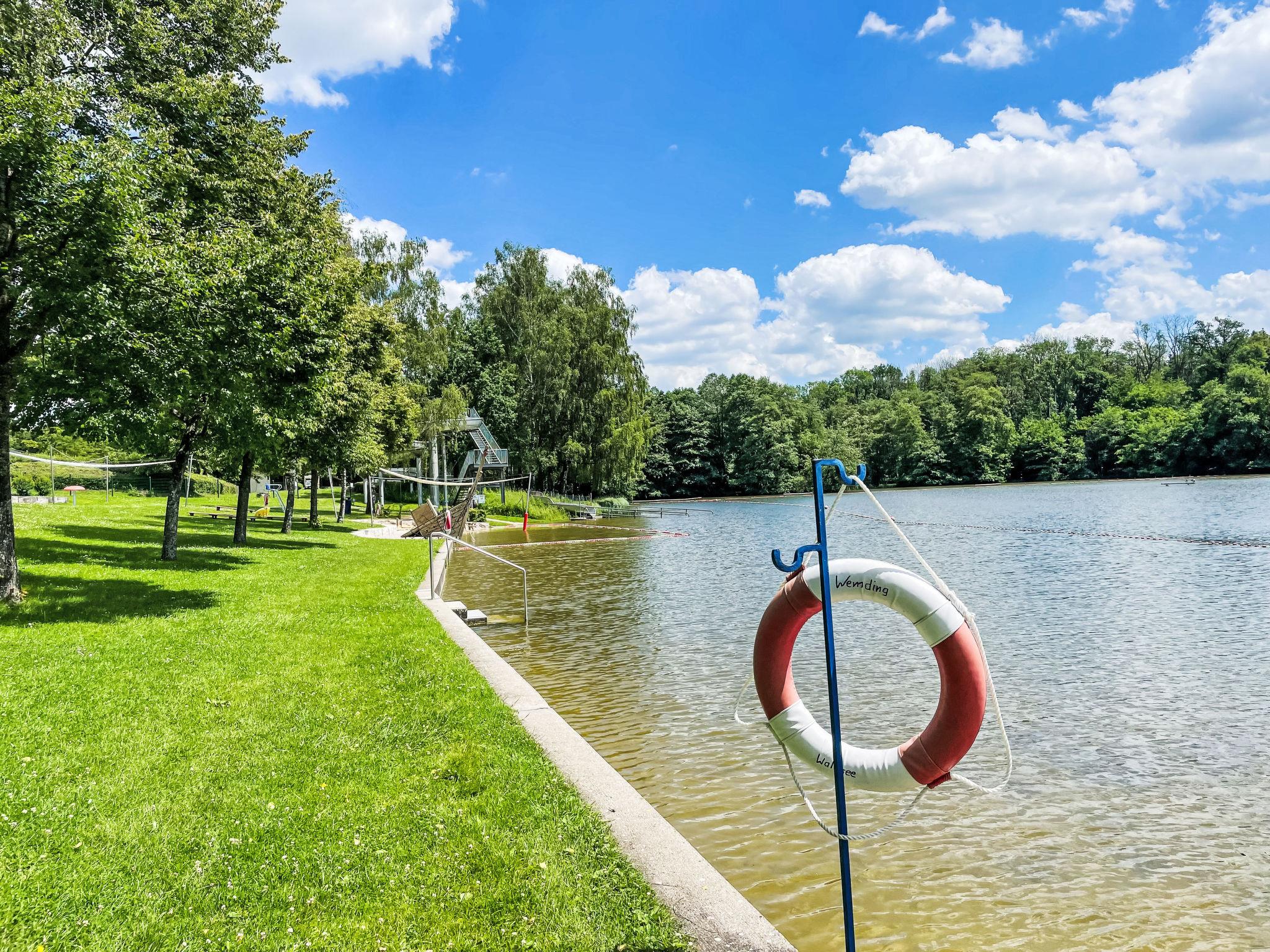 Ferienanlage "Campingpark Wemding". 50 Häuser im Ferienresort. Ausserhalb des Ortes, 2 km vom Zentrum von Wemding, 50 m vom See. Zur Mitbenutzung: Rutschbahn, Aussendusche, Beachvolleyball, Kinderspielplatz, Badeplatz. In der Anlage: Wireless LAN, Kiosk. 400 m lange Zufahrt bis zum Haus. Zentralparkplätze. Supermarkt 2 km, Restaurant 2 km, Bushaltestelle "Johannisgraben-Wemding" 2.2 km, Bahnstation "Nördlingen" 20 km, Thermalbad "Treuchtlingen" 21 km. Tennis 1 km, Minigolf 50 m, Reitstall 1 km, Eisfeld 500 m. Nahe gelegene Sehenswürdigkeiten: Nördlingen / Rieskrater-Museum 19 km, Dinkelsbühl 43 km, Legoland Günzburg 80 km, Playmobil-FunPark bei Nürnberg 100 km, Augsburg 70 km, München 130 km. Bekannte Seen in der Umgebung sind gut erreichbar: Altmühlsee 35 km, Brombachsee 40 km. Bitte beachten: geeignet für Familien. Die Residenz wird durch elektrische Tore geschlossen. Zufahrt zum Haus nur zwischen 7 -22 Uhr möglich. Hunde sind am Strand und Liegewiese nicht erlaubt. Kiosk nur saisonal geöffnet (Mitte Mai bis Mitte September).