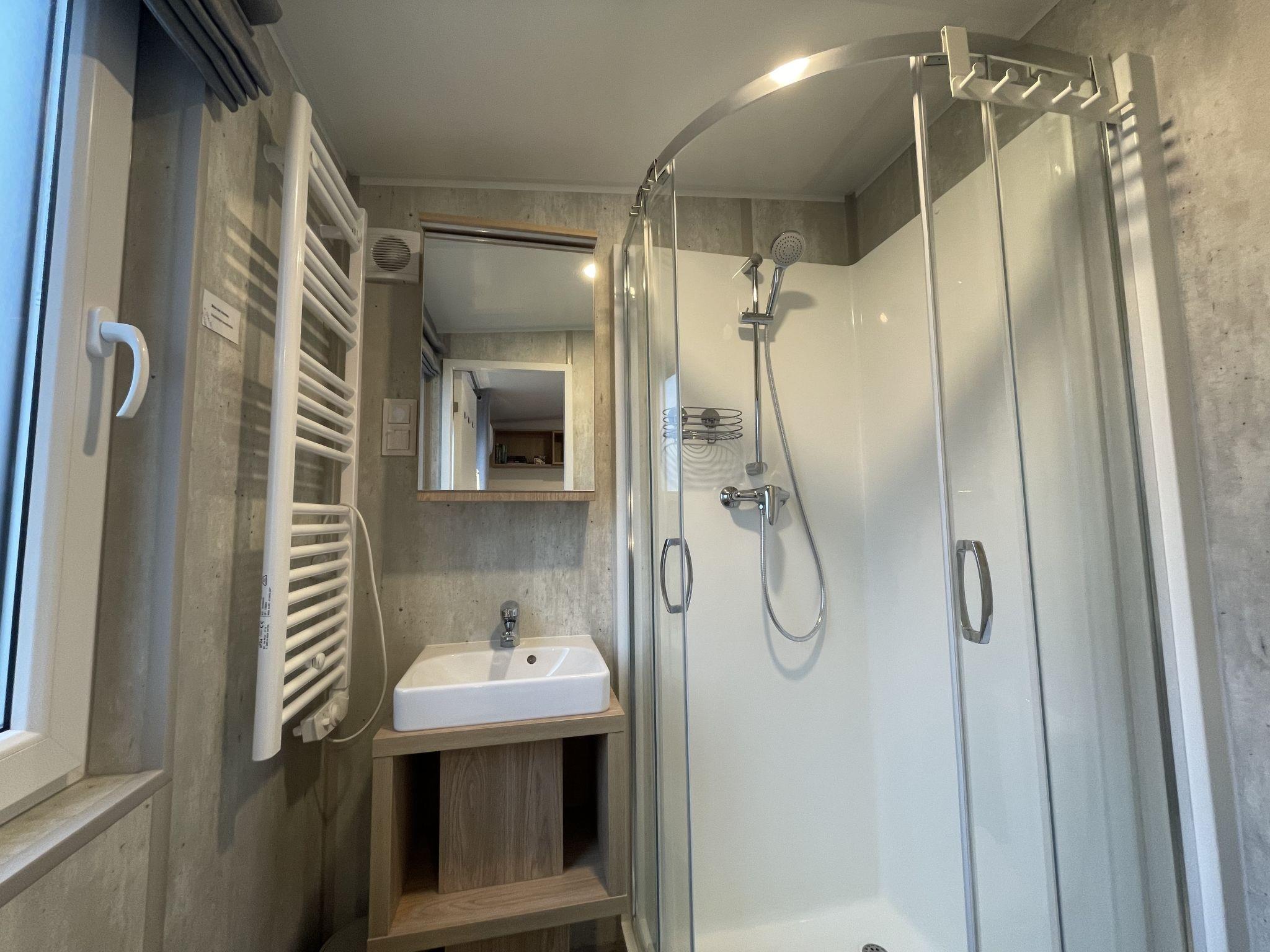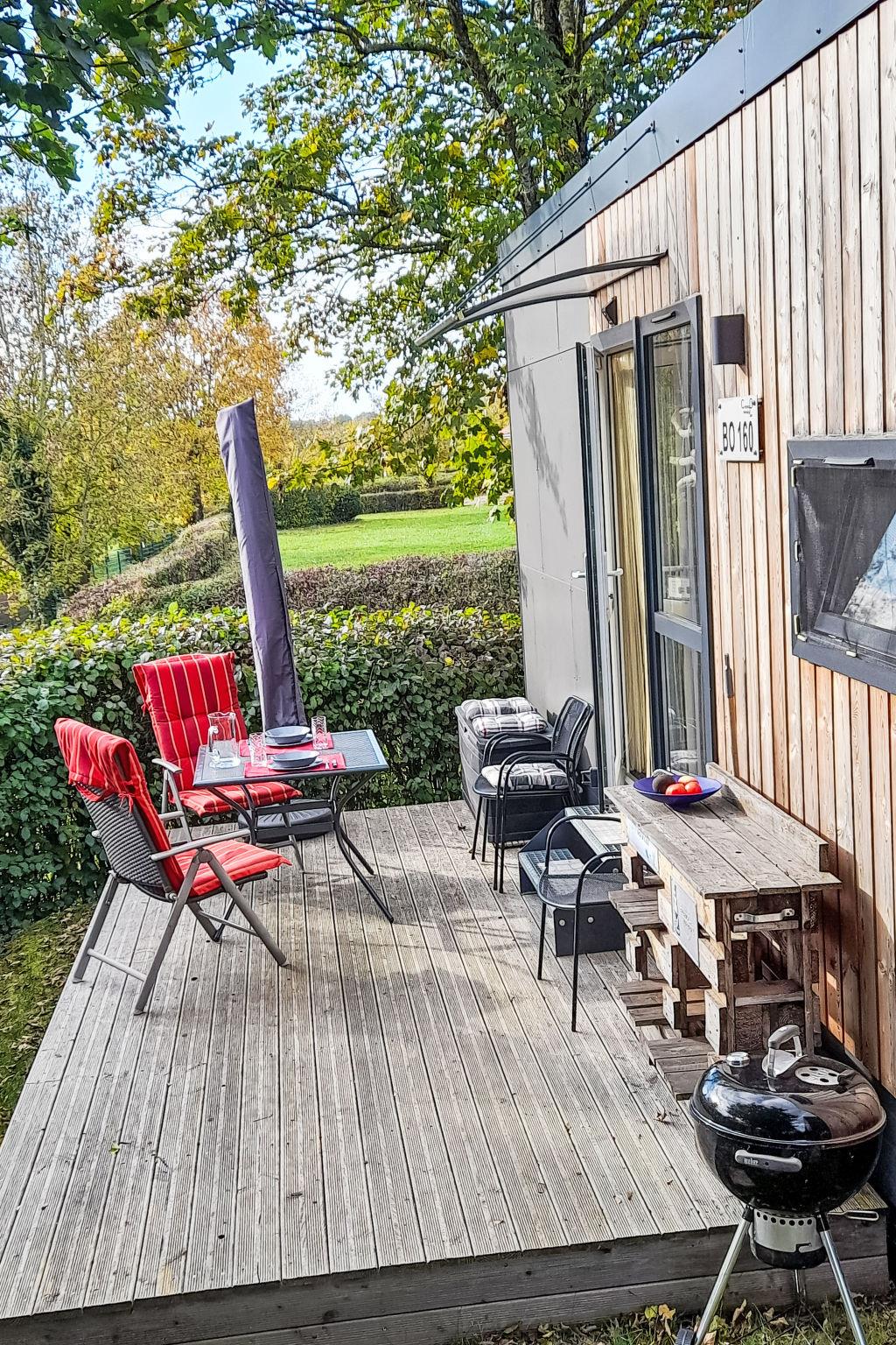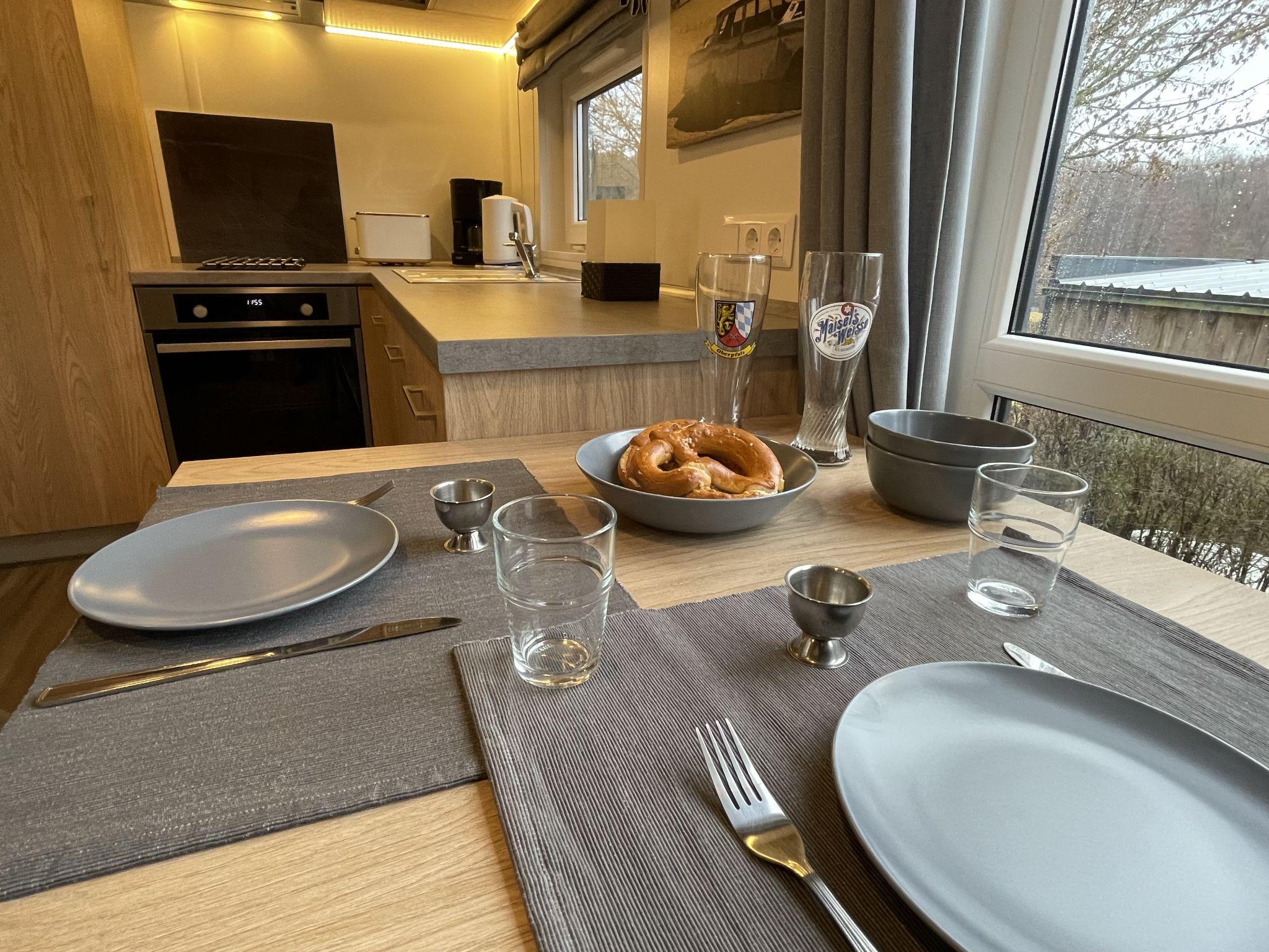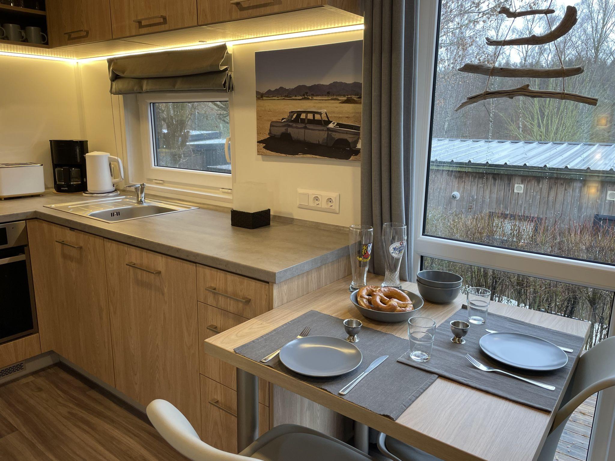 "Tiny Haus Auszeit am See", 2-Zimmer-Mobilheim 25 m2, im Erdgeschoss. Objekt geeignet für 2 Erwachsene + 2 Kinder. Gemütlich eingerichtet: Wohn-/Schlafzimmer mit 1 Doppeldiwanbett und Sat-TV. Ausgang zur Terrasse. 1 Zimmer mit 1 franz. Bett (140 cm, Länge 200 cm). Offene Küche (Backofen, 2 Induktionskochplatten, Toaster, Wasserkocher, elektrische Kaffeemaschine). Dusche/WC. E-Heizung, Klimaanlage. Terrasse. Terrassenmöbel, Gartengrill, Liegestühle. Zur Verfügung: Kinderhochstuhl. Bitte beachten: Nichtraucher-Haus. Rauchmelder. ACHTUNG: Die WLAN-Verbindung kann je nach Kapazität eingeschränkt sein.