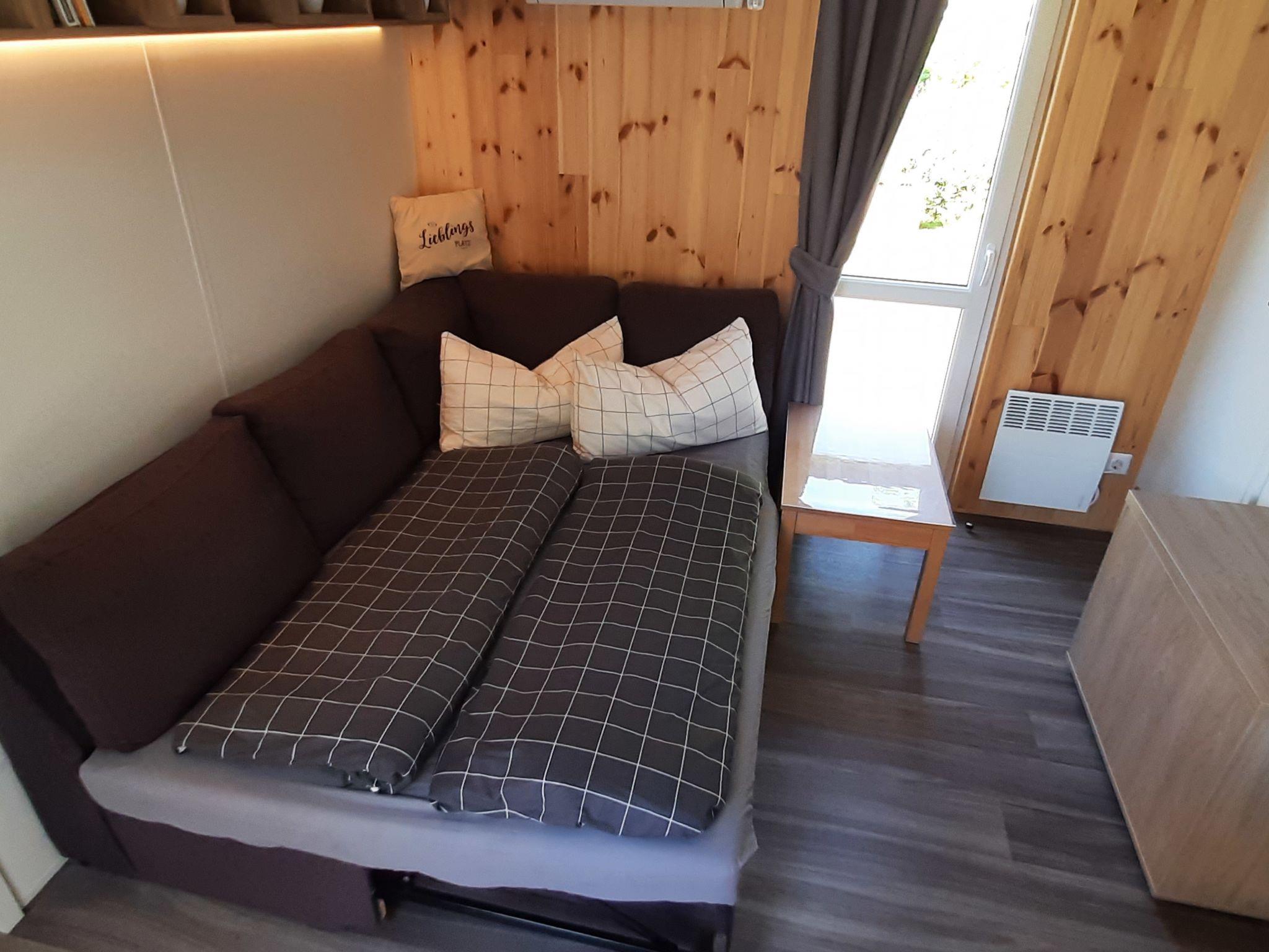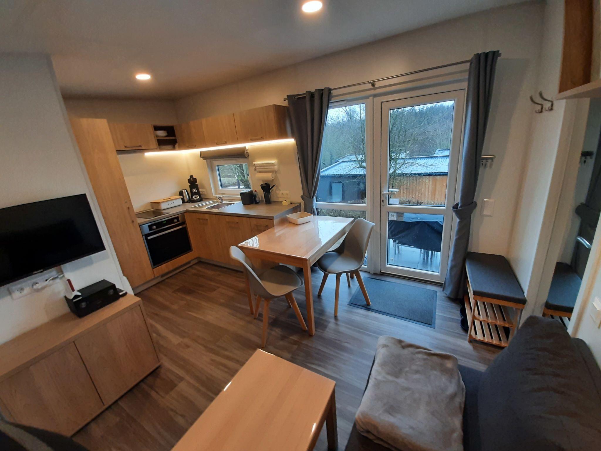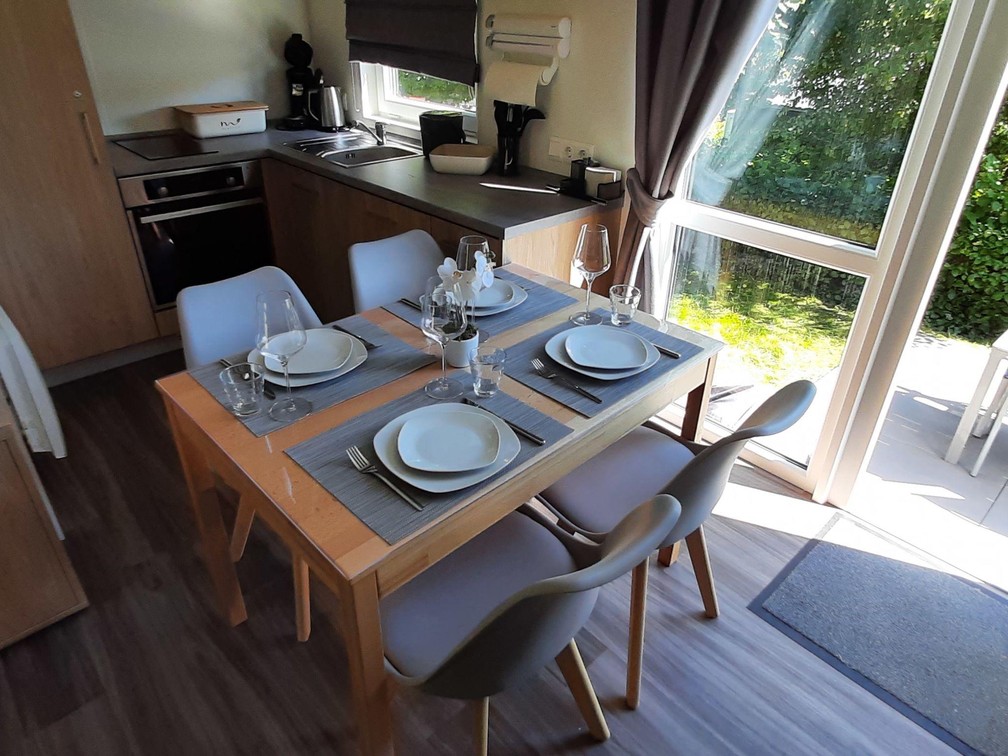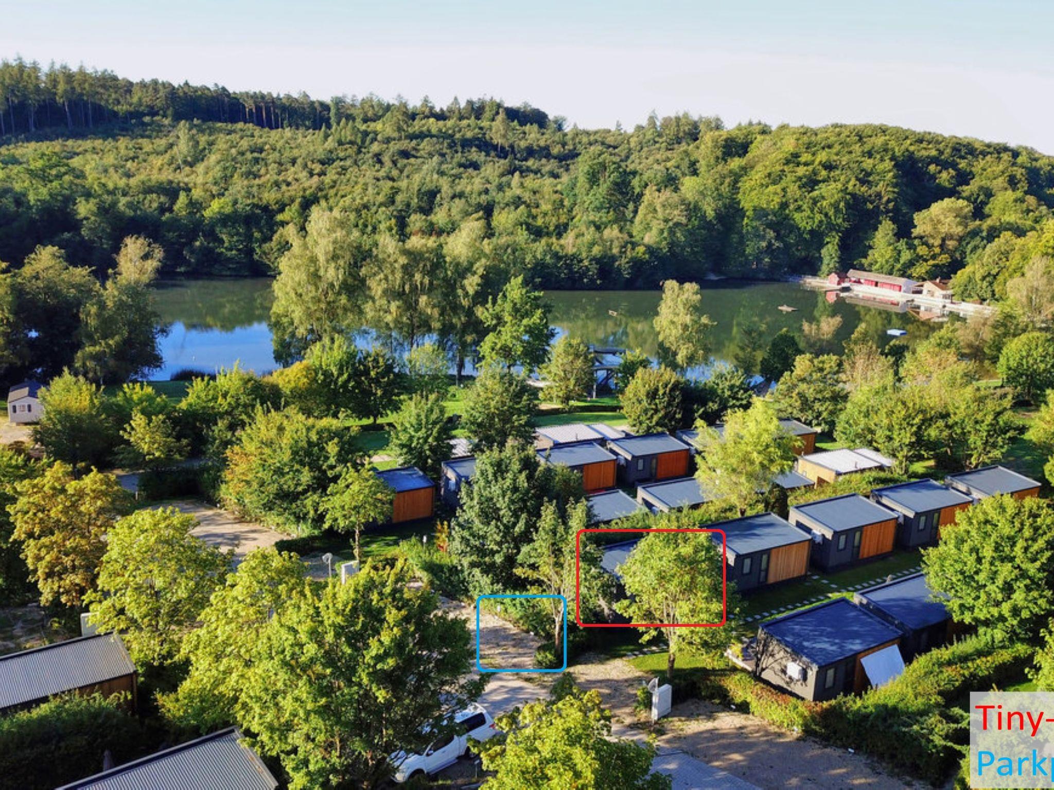 "Tiny Haus am Waldsee", 2-Zimmer-Mobilheim 25 m2. Objekt geeignet für 2 Erwachsene + 2 Kinder. Gemütlich eingerichtet: Wohn-/Schlafzimmer mit 1 Doppeldiwanbett (135 cm, Länge 190 cm), Esstisch und Sat-TV (Flachbildschirm). Ausgang zur Terrasse. 1 Zimmer mit 1 franz. Bett (140 cm, Länge 200 cm). Offene Küche (2 Induktionskochplatten, Toaster, Wasserkocher, Mikrowelle). Dusche/WC. E-Heizung, Klimaanlage. Terrasse. Terrassenmöbel, Gartengrill, Liegestühle (2). Zur Verfügung: Haartrockner. Internet (WLAN, gratis). Parkplatz (1 Auto) in 10 m. Bitte beachten: Nichtraucher-Haus. Rauchmelder. Senseo Kaffeemaschine.